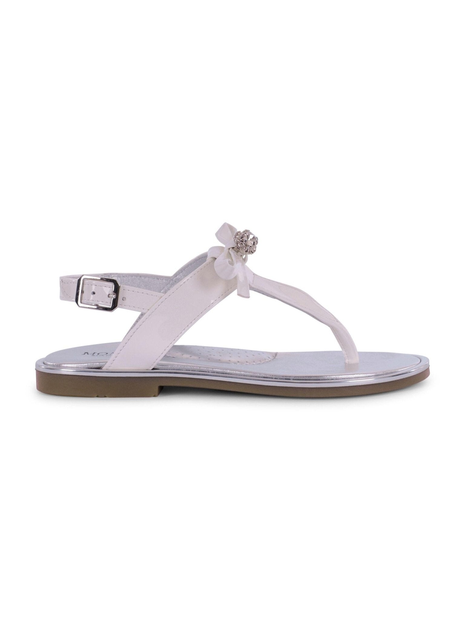 Il prodotto Sandali per bambina Monnalisa bianchi con dettaglio fiocco è disponibile sullo store online RubinoKids.com. Realizzato in pelle di vitello 100%. Il prodotto presenta un colore bianco, dettaglio con fiocco, decorazione con perline, chiusura con fibbia, cinturino a T, suola piatta. Varie taglie a catalogo, appartiene alla collezione Monnalisa Primavera/Estate 2026 ed é disponibile con consegna in 24/48h per l'italia.