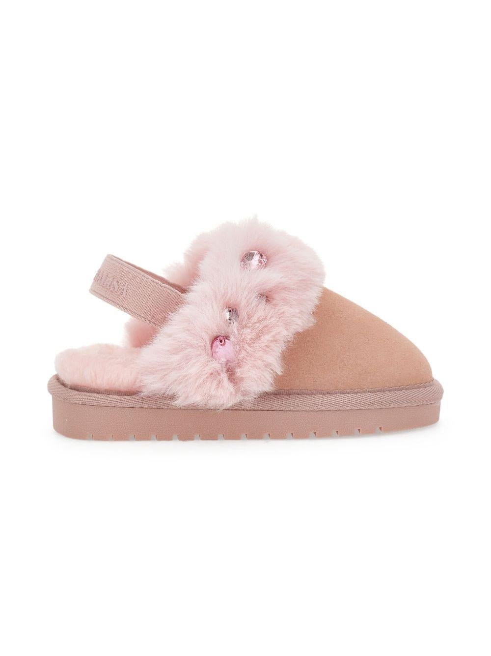The Monnalisa pink slippers for girls with faux fur trim are available on the RubinoKids.com online store. Made of 100% fabric, they feature a pink color, an elasticated heel strap, a bow detail, and a faux fur trim. Available in various sizes, they are part of the Monnalisa Fall/Winter 2025 collection and are available for 24-48 hour delivery in Italy.