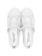 The Monnalisa white leather ballerina flats for girls with a velcro front closure are available on the RubinoKids.com online store. Made of 100% goatskin, they feature a white color, a velcro front closure, a flat rubber sole, a leather insole with a logo, and a bow detail. Available in various sizes, they are part of the Monnalisa Spring/Summer 2025 collection and are available for immediate shipment with delivery within 24-48 hours in Italy.