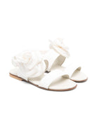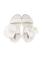 The Andrea Montelpare girls' sandals in white with flower appliqués are available on the RubinoKids.com online store. Made of 100% leather, they feature a white color, a velcro closure at the back, a logo insole, and a wedge heel. Available in various sizes, they are part of the MONTELPARE TRADITION Spring/Summer 2025 collection and are available for immediate shipment with delivery within 24-48 hours in Italy.