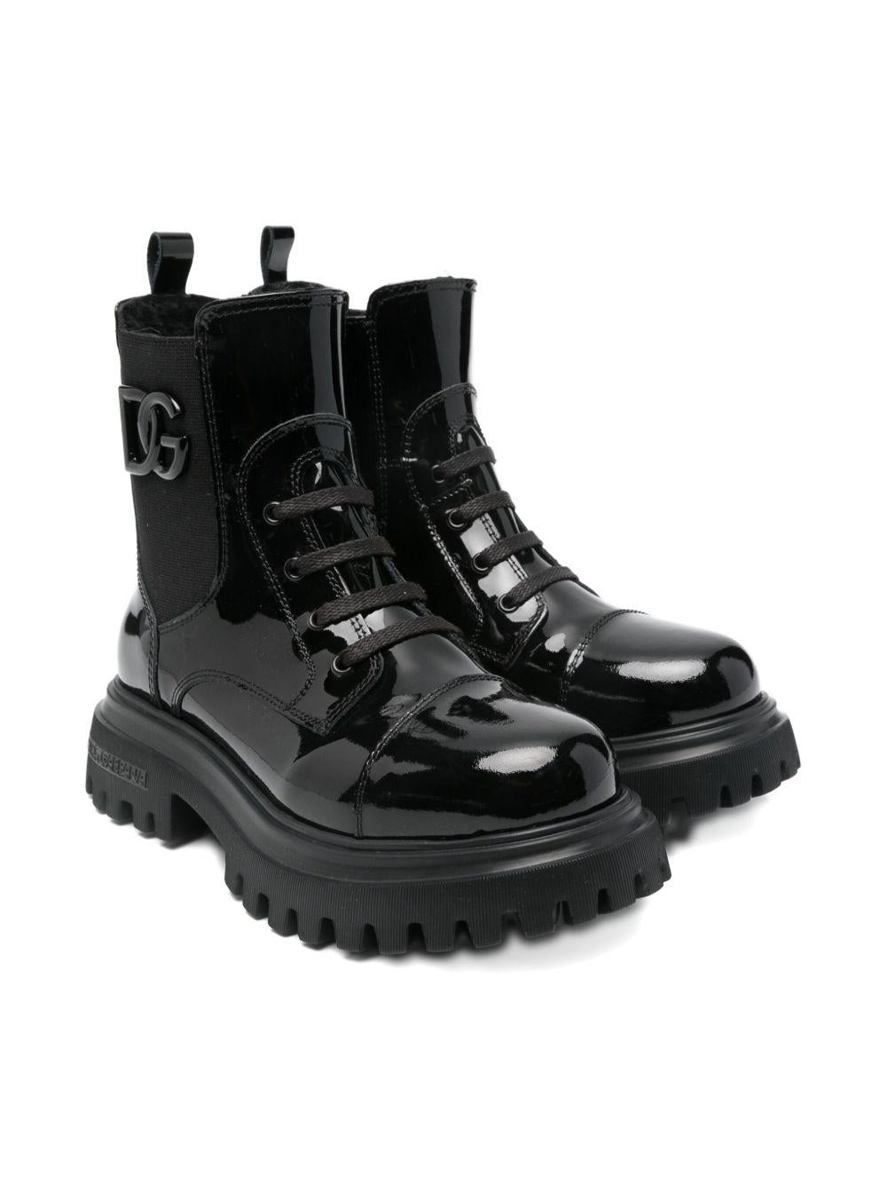 The Dolce & Gabbana Kids black boots with logo plaque for girls are available on the RubinoKids.com online store. Made of 70% shiny leather and 30% fabric, they feature a black color, a shiny finish, leather, a lace-up closure, a logo plaque, and a chunky rubber sole. Available in various sizes, they are part of the Dolce & Gabbana Kids Fall/Winter 2025 collection and are available for 24-48 hour delivery in Italy.