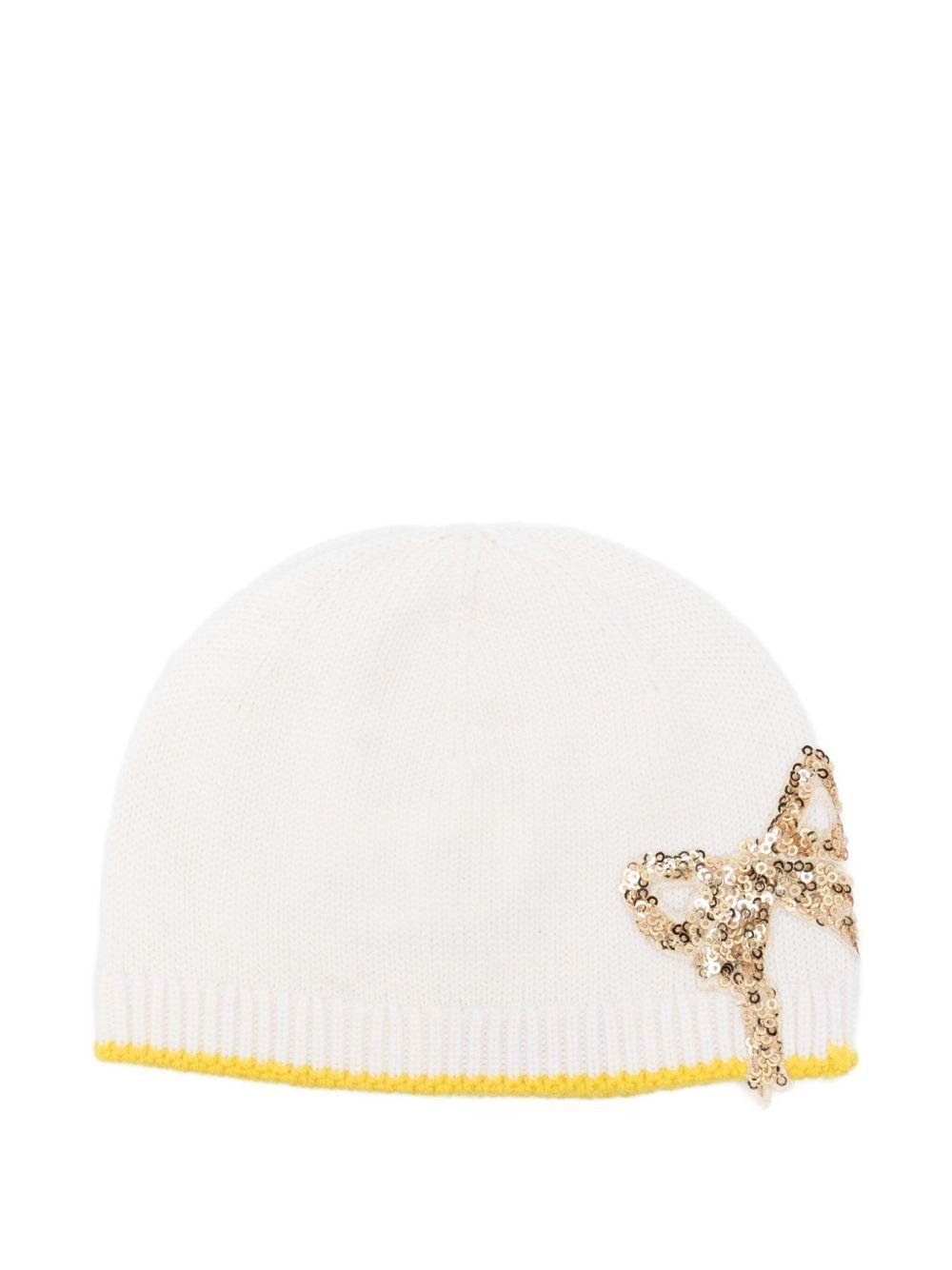 The Gensami Kids baby girl's hat in white with yellow trim is available on the RubinoKids.com online store. Made of 100% wool, it features a white bow and a ribbed hem. Available in various sizes, it is part of the Gensami Kids Fall/Winter 2025 collection and is available for 24-48 hour delivery in Italy.