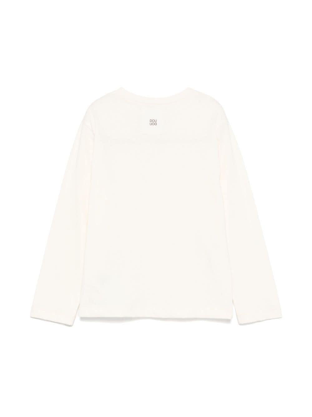 The Douuod Kids ecru sweater for girls with logo appliqué on the chest is available on the RubinoKids.com online store. Made of 100% cotton, the ecru jersey t-shirt features a crew neck, logo appliqué on the chest, long sleeves, and a straight hem. Available in various sizes, it is part of the Douuod Kids Fall/Winter 2024 collection and is available for immediate shipment with delivery within 24-48 hours in Italy.