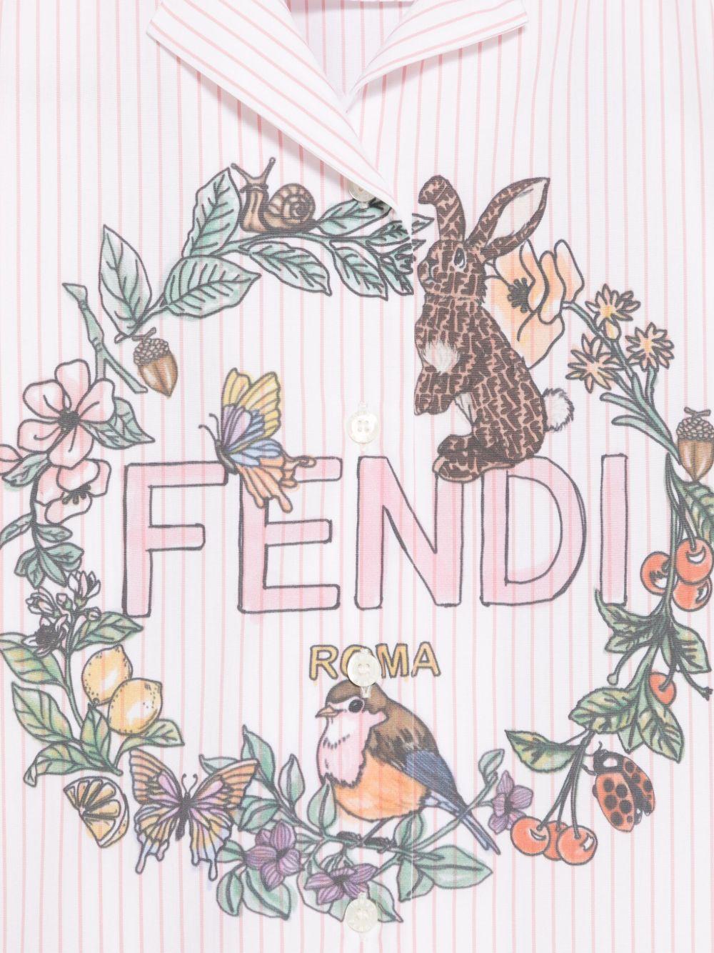 The Fendi Kids pink shirt for girls with a graphic print on the front is available on the RubinoKids.com online store. Made of 100% cotton, it features pink short sleeves, a straight hem, and a graphic print on the front. Available in various sizes, it is part of the Fendi Kids Spring/Summer 2025 collection and is available for immediate shipment with delivery within 24-48 hours in Italy.