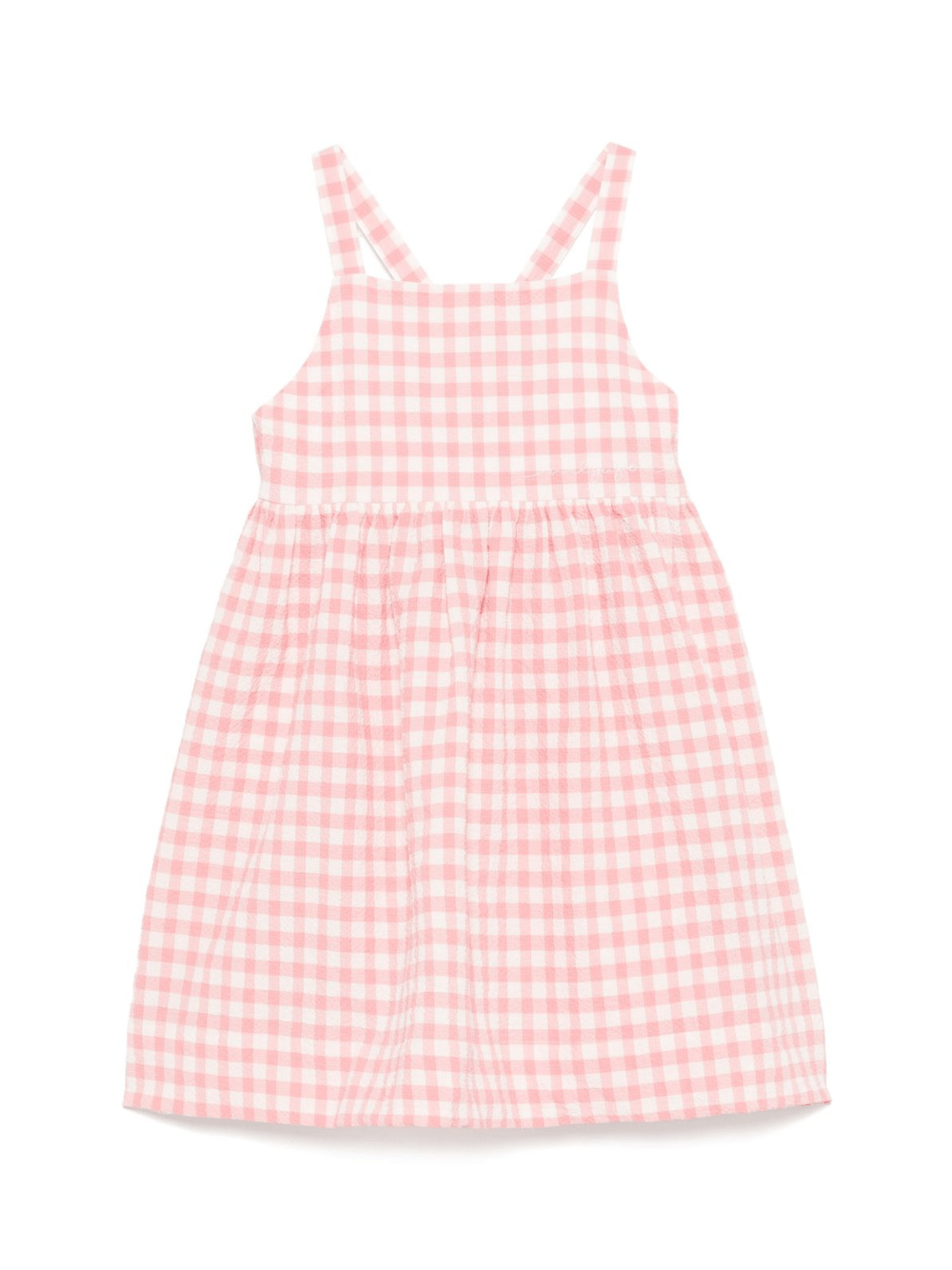The Il Gufo pink checked dress for girls is available on the RubinoKids.com online store. Made of 100% cotton, it features a bubblegum pink color, an elasticated waistband, an embroidered logo on the front, and crossed shoulder straps at the back. Available in various sizes, it is part of the Il Gufo Spring/Summer 2025 collection and is available for immediate shipment with delivery within 24-48 hours in Italy.
