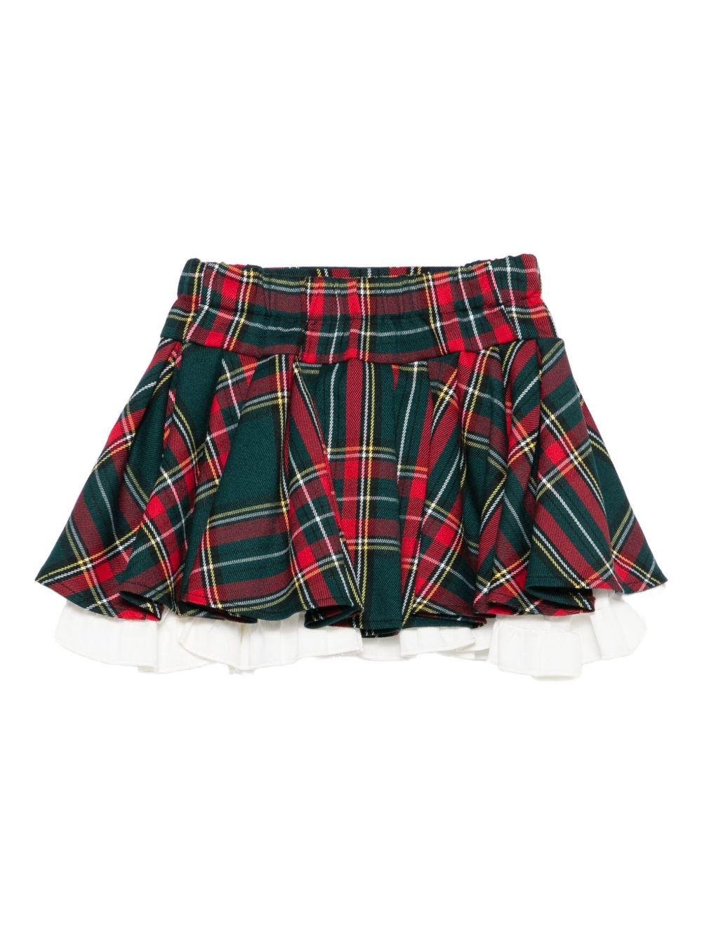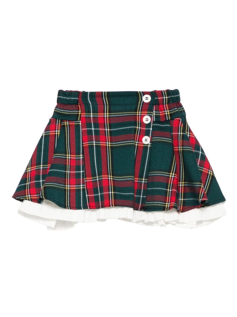 The La Stupenderia multicolored checked miniskirt for newborns is available on the RubinoKids.com online store. Made of 63% polyester, 35% viscose, and 2% elastane, it features a green/red color scheme, a black gathered hem, and an elastic waistband. Available in various sizes, it is part of the La Stupenderia Fall/Winter 2025 collection and is available for 24-48 hour delivery in Italy.