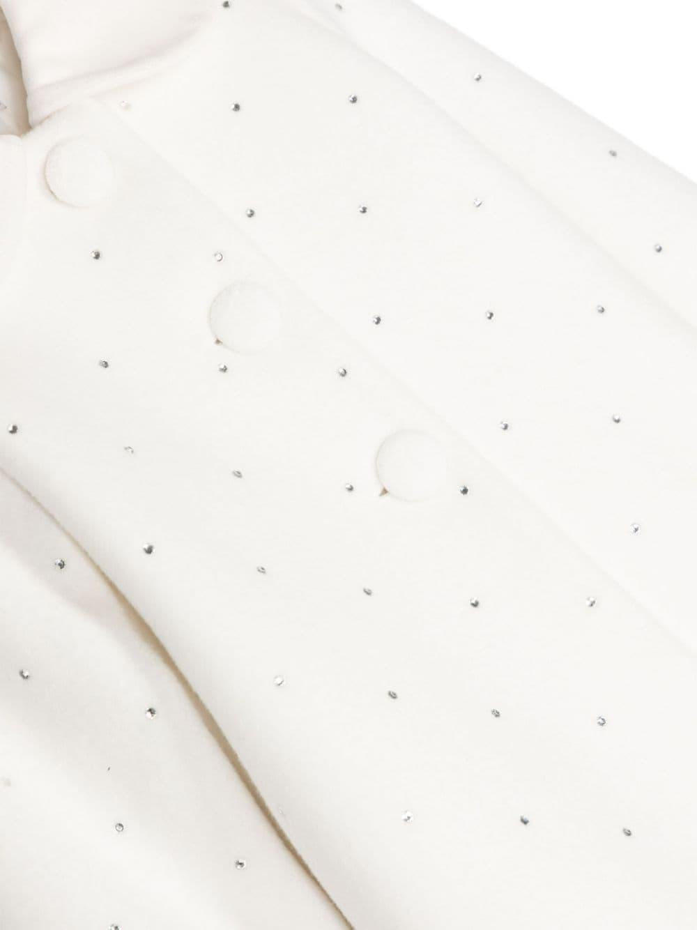 The Monnalisa rhinestone coat for newborns in white with a round collar is available on the RubinoKids.com online store. Made of 100% cotton, the coat features an ivory white hue, a felt finish, rhinestone embellishments, a round collar, long sleeves, inverted back pleats, a straight hem, a fully lined interior, and a front closure with fabric-covered buttons. Available in various sizes, it is part of the Monnalisa Fall/Winter 2024 collection and is available for immediate shipment with delivery within 24-48 hours in Italy.