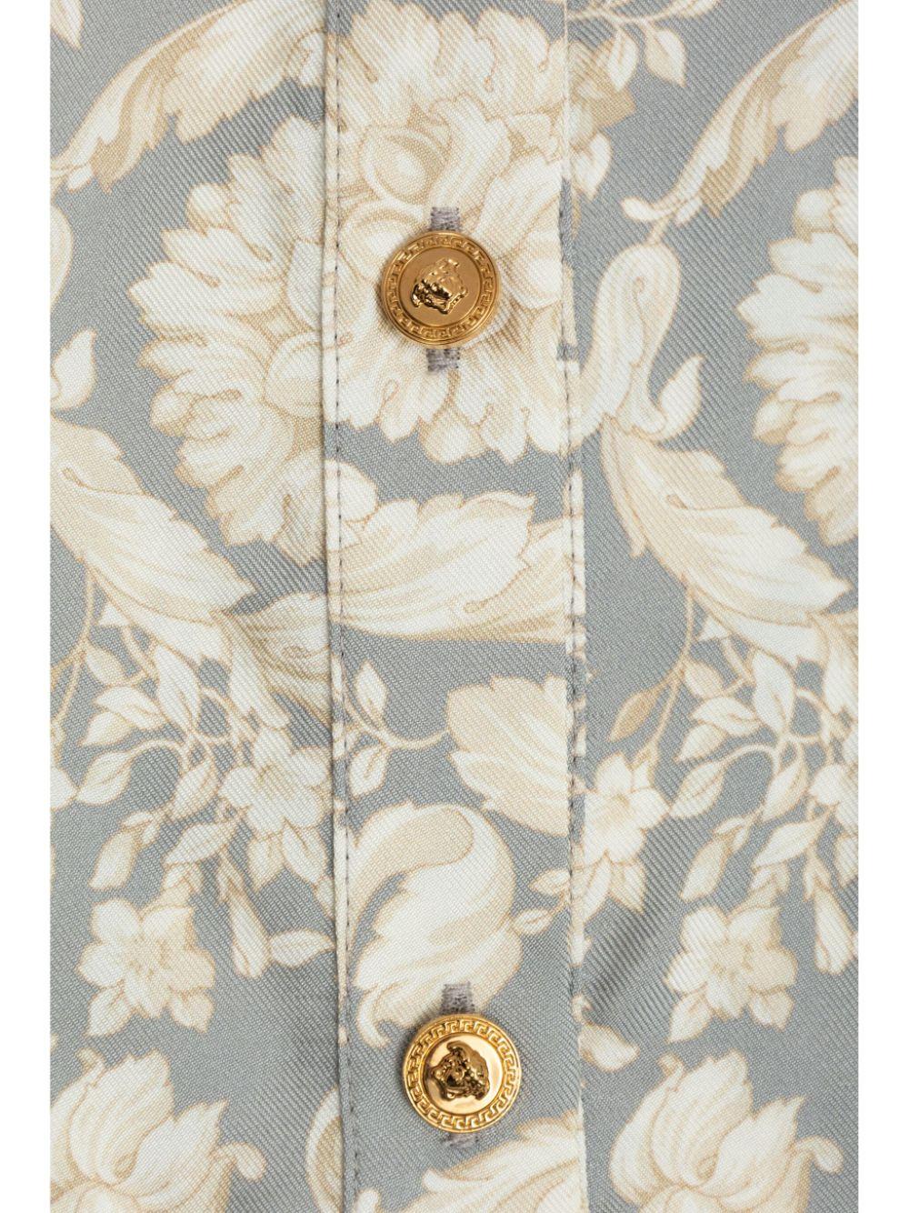 The Versace Kids gray shirt dress with Baroque print for girls is available on the RubinoKids.com online store. Made of 100% silk, it features a light gray/beige color, a front button closure, a distinctive Baroque print, a classic collar, and a ruffled hem. Available in various sizes, it is part of the Versace Kids Spring/Summer 2025 collection and is available for immediate shipment with delivery within 24-48 hours in Italy.