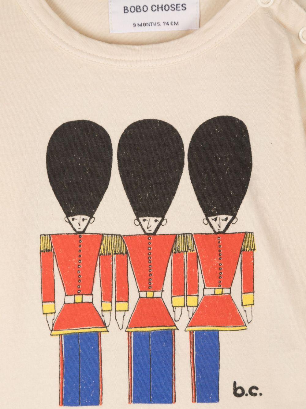 The Bobo Choses beige tin soldier T-shirt for babies with a graphic print on the front is available on the RubinoKids.com online store. Made of 100% cotton, it features a light beige organic cotton jersey fabric, a crew neck, long sleeves, a graphic print on the front, and a straight hem with a snap button closure on the shoulder. This size is part of the Bobo Choses Fall/Winter 2024 collection and is available for immediate shipment with delivery within 24-48 hours in Italy.