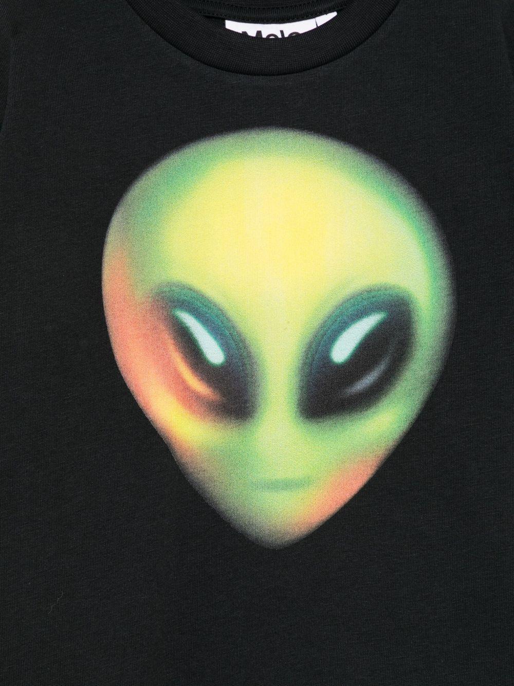 The black Molo printed T-shirt for boys is available on the RubinoKids.com online store. Made of 100% cotton, it features a black alien print, short sleeves, and a crew neck. Available in various sizes, it is part of the Molo Fall/Winter 2025 collection and is available for 24-48 hour delivery in Italy.