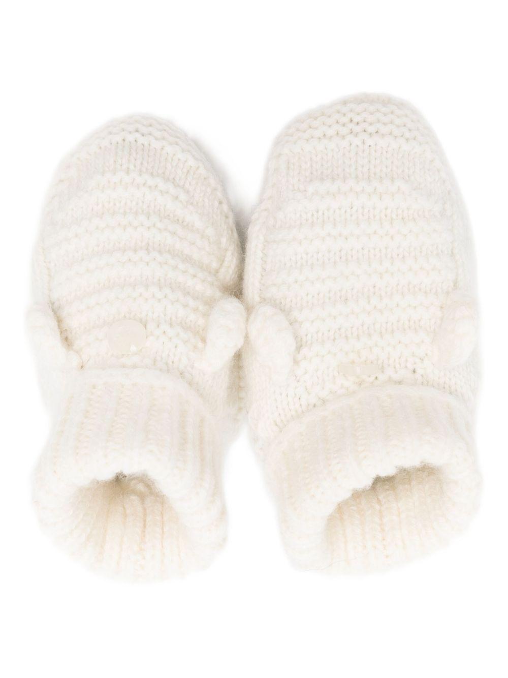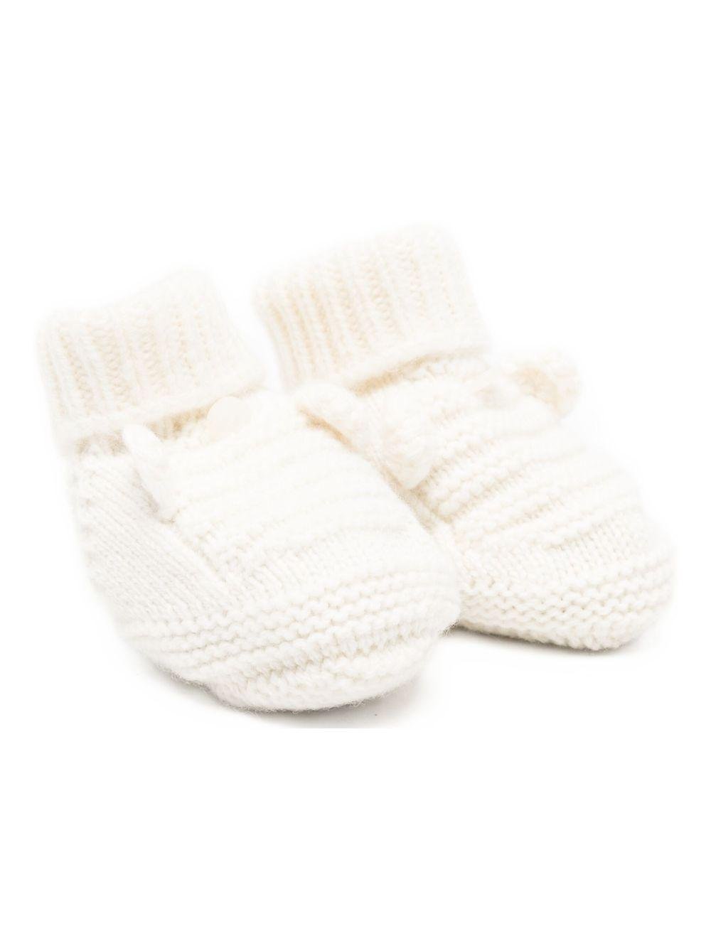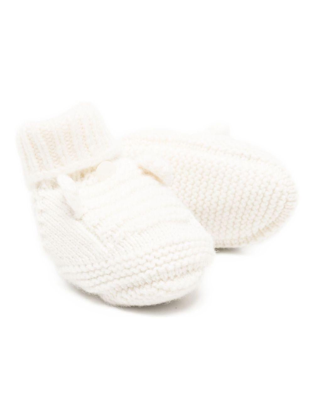 The Tartine Et Chocolat white baby first steps shoes with pompom detail is available on the RubinoKids.com online store. Made of 100% cashmere, the product features a white, braided knit, pompom detail, ribbed cuffs, and a soft texture. Available in various sizes, it is part of the Tartine Et Chocolat Fall/Winter 2025 collection and is available for 24-48 hour delivery in Italy.