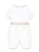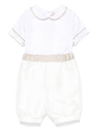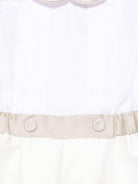 The product La Stupenderia white baby onesie with collar is available on the RubinoKids.com online store. Made of 100% cotton, 85% polyester, 15% silk. The onesie features a white color, jacquard monogram, back closure with hidden snaps, rounded collar, pleated details, short sleeves, buttoned cuffs, elastic waist, decorative button details, anklet detail, cotton lining. Various sizes in the catalog, it belongs to the La Stupenderia Autumn/Winter 2024 collection and is available for immediate shipment with delivery in 24/48 hours for Italy.