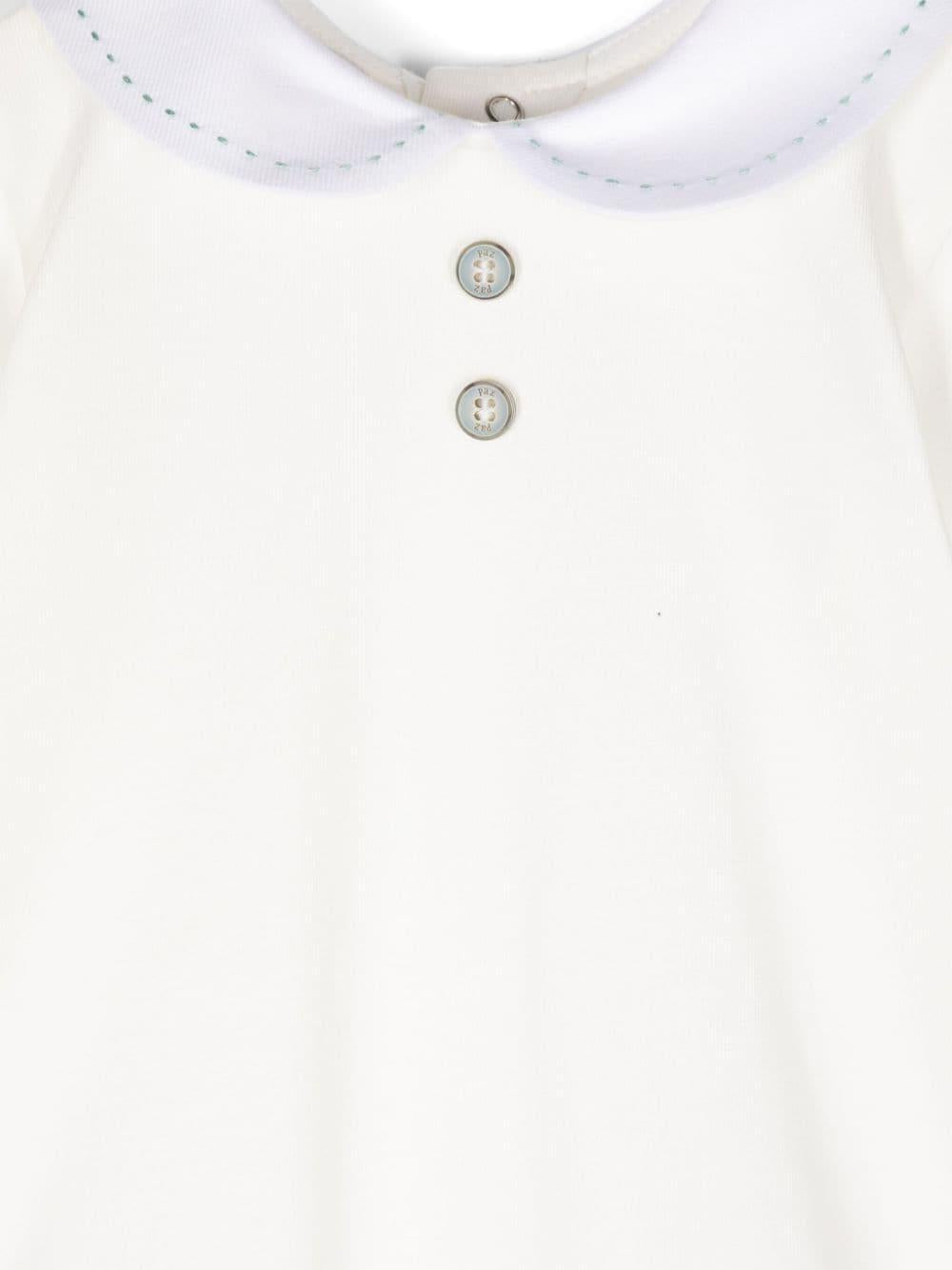 The Paz Rodriguez white cotton baby girl bodysuit with decorative stitching is available on the RubinoKids.com online store. Made of 100% cotton, the bodysuit features a white cotton jersey, a Peter Pan collar, decorative stitching, long sleeves, an elasticated hem, and a snap button closure at the back. Available in various sizes, it is part of the Paz Rodriguez Fall/Winter 2024 collection and is available for immediate shipment with delivery within 24-48 hours in Italy.