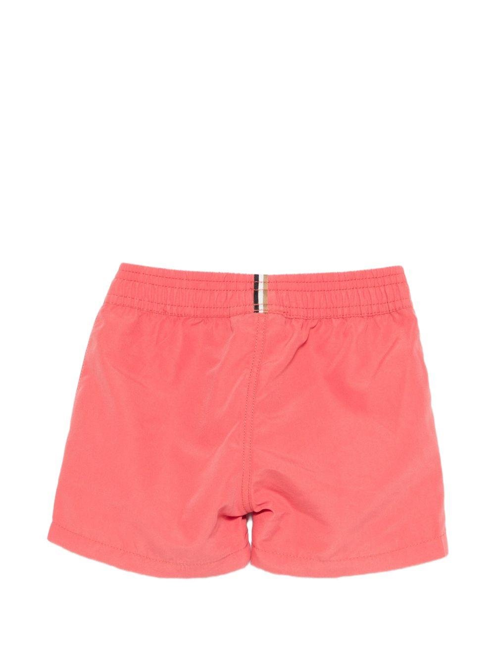 The Boss Kids red drawstring baby swimsuit is available on the RubinoKids.com online store. Made of 100% polyester, it features a red color, a logo print, and an elastic waistband. Available in various sizes, it is part of the Boss Kids Spring/Summer 2026 collection and is available for 24-48 hour delivery in Italy.