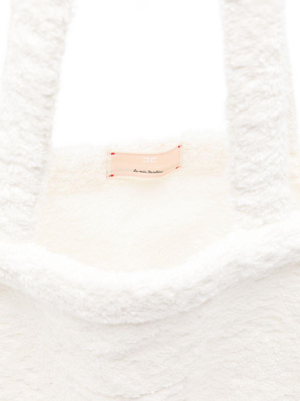 The Elisabetta Franchi La Mia Bambina white shoulder bag with embroidered logo is available on the RubinoKids.com online store. Made of 90% cotton, 10% polyester, it features a matte white color, a textured effect, a double handle, and an embroidered logo detail. Available in various sizes, it is part of the Elisabetta Franchi La Mia Bambina Spring/Summer 2026 collection and is available for 24/48 hour delivery in Italy.