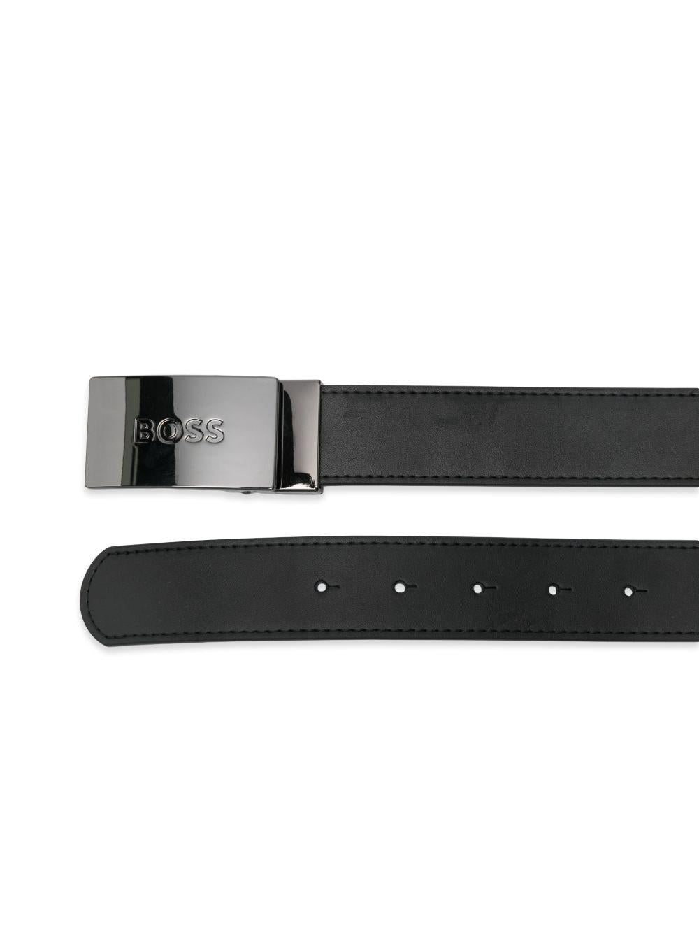 This product is available on the RubinoKids.com online store. Made of 100% calfskin, it features a black color, a reversible design, and a buckle closure. Available in various sizes, it is part of the Boss Kids Spring/Summer 2026 collection and is available for 24-48 hour delivery in Italy.