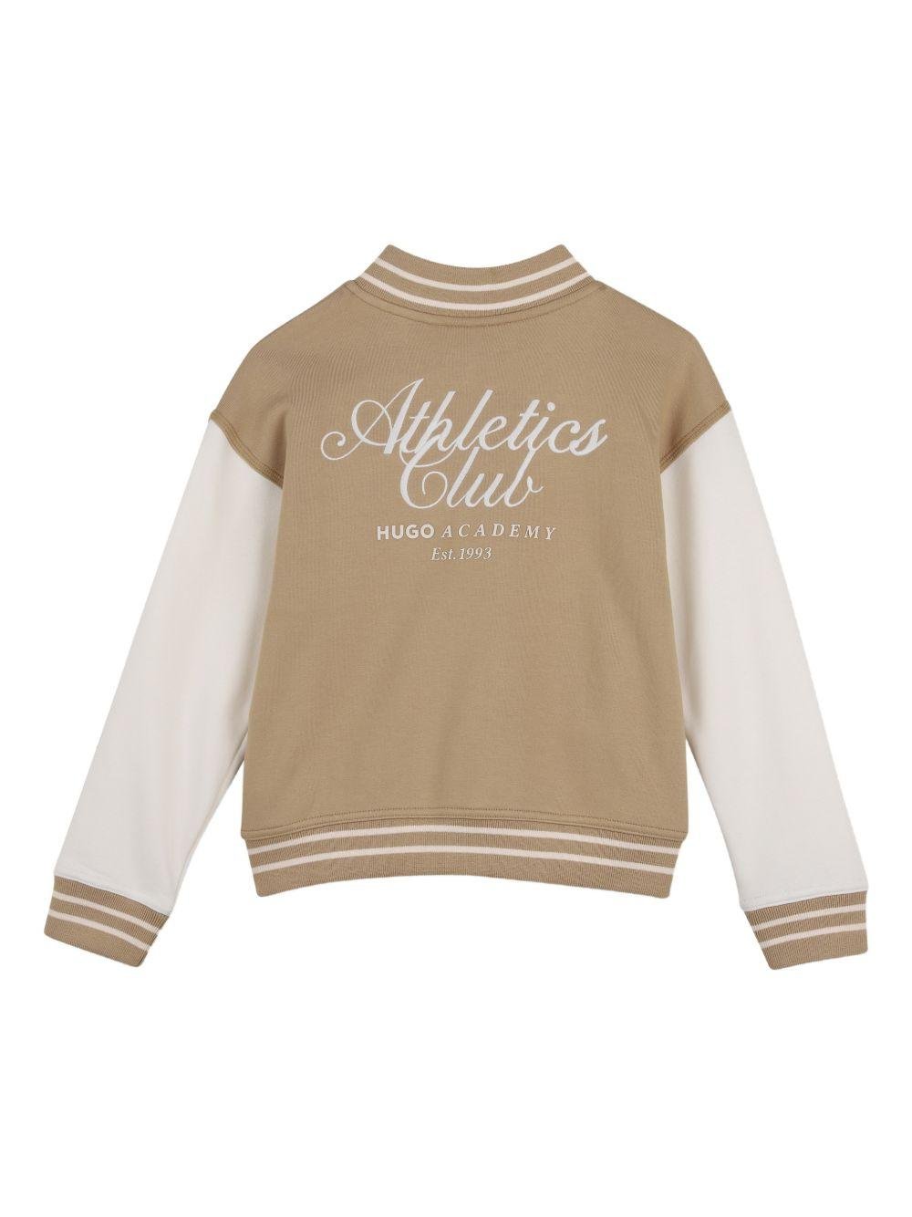The Hugo Kids brown sweatshirt with white inserts for boys is available on the RubinoKids.com online store. Made of 50% cotton, 50% polyester, it features a light brown color, white inserts, a striped detail, a button closure, and a side welt pocket. Available in various sizes, it is part of the Hugo Kids Spring/Summer 2026 collection and is available for 24-48 hour delivery in Italy.