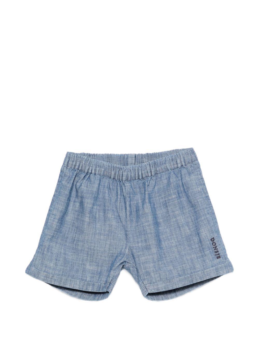 The Donsje denim shorts for babies with an elastic waist are available on the RubinoKids.com online store. Made from 100% cotton, they feature a denim color, an elastic waist, a cuffed hem, and button details. Available in various sizes, they are part of the Donsje Spring/Summer 2026 collection and are available for 24-48 hour delivery in Italy.