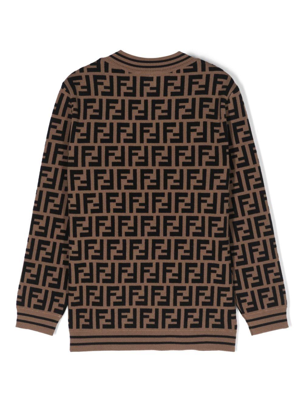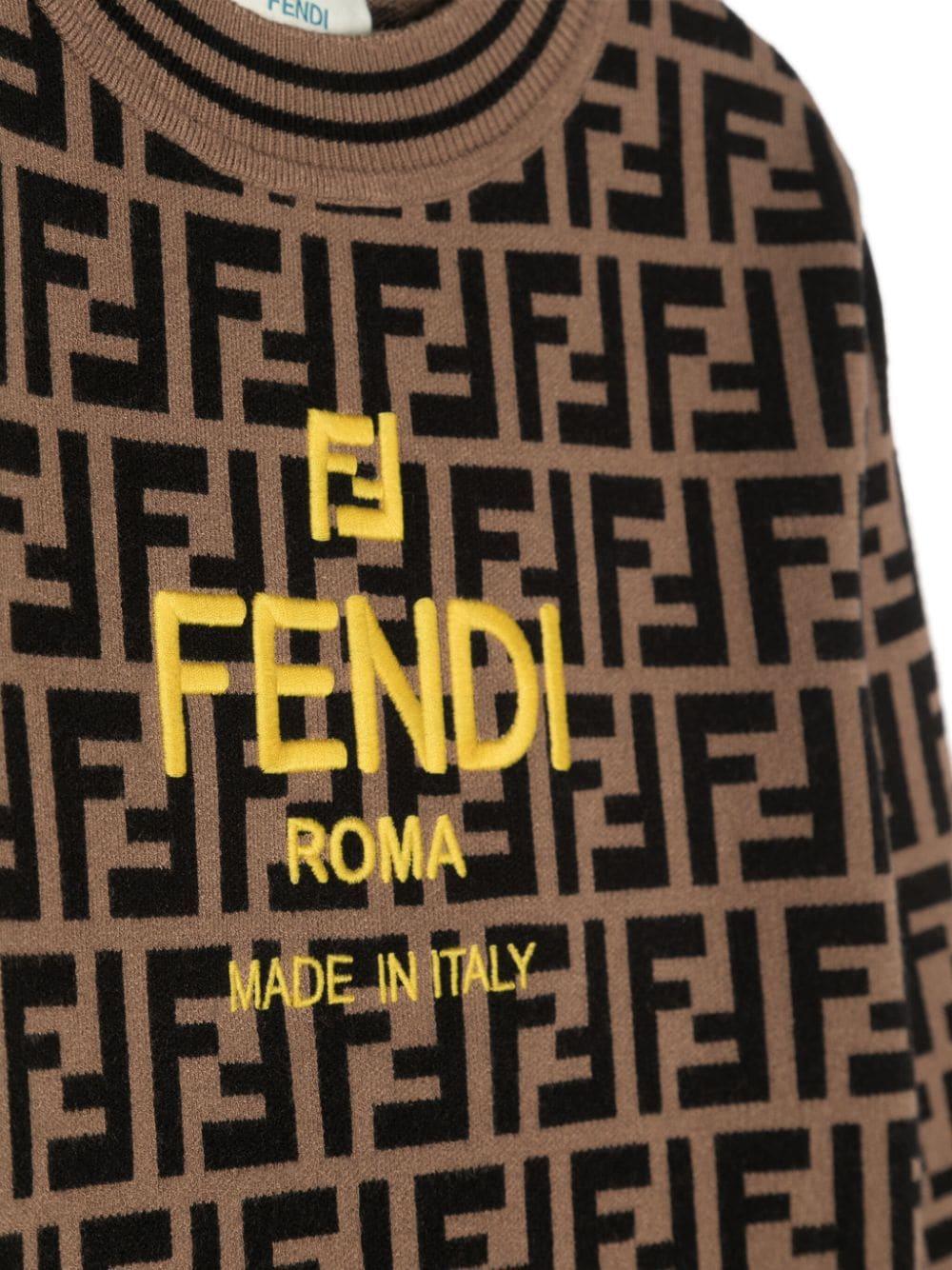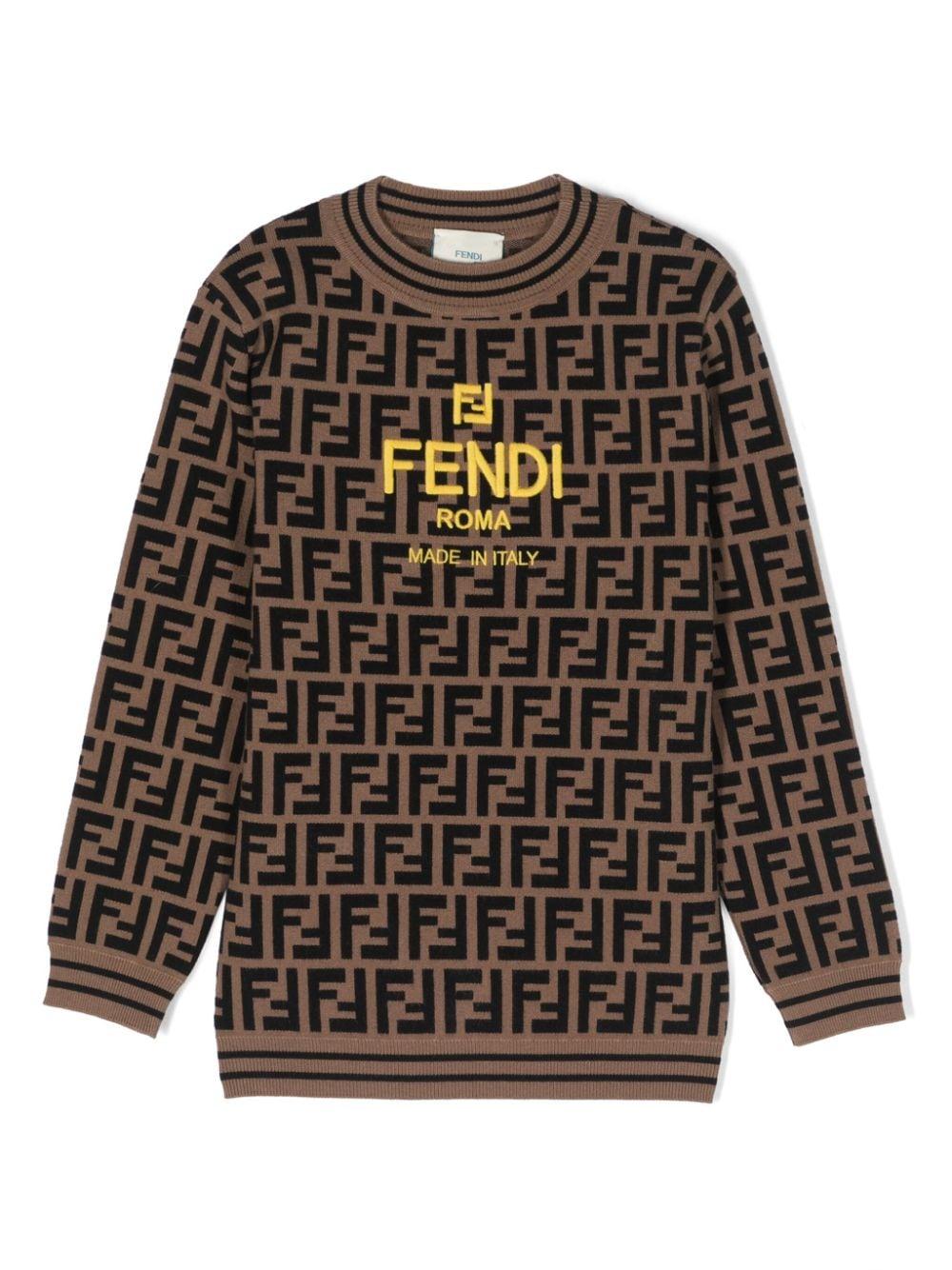 The Fendi Kids logo sweater is available on the RubinoKids.com online store. The sweater features a logo design, a straight hem, a crew neck, long sleeves, and an embroidered logo. Available in various sizes, it is part of the Fendi Kids Spring/Summer 2024 collection and is available for immediate shipment with delivery within 24-48 hours in Italy.