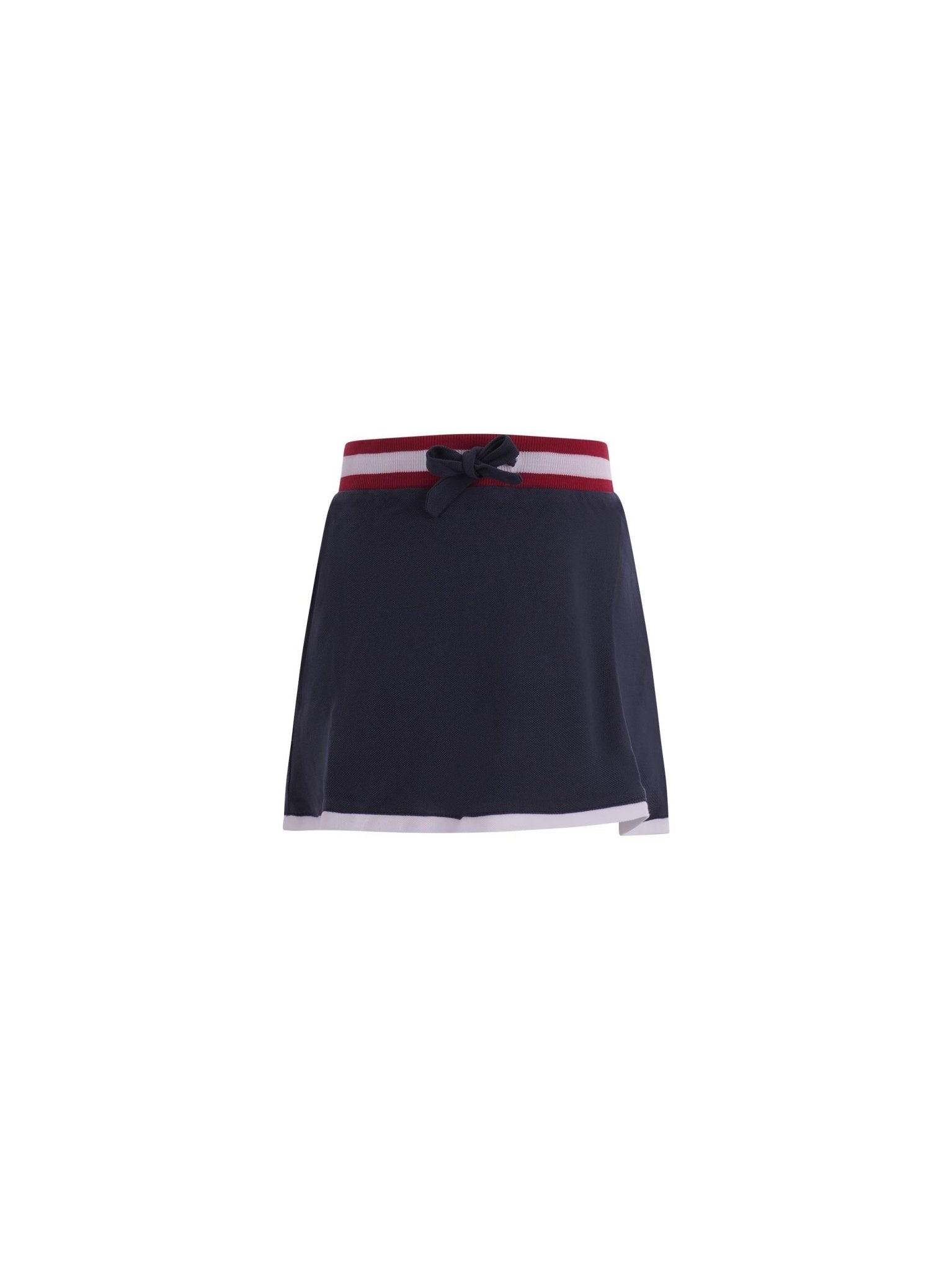 The Monnalisa two-piece set of a blue t-shirt and pleated skirt for girls with a graphic print on the front is available on the RubinoKids.com online store. Made of 100% cotton, it features a blue and white color scheme, a striped trim, pleats, and a drawstring closure. Available in various sizes, it is part of the Monnalisa Spring/Summer 2026 collection and is available for delivery in 24-48 hours in Italy.