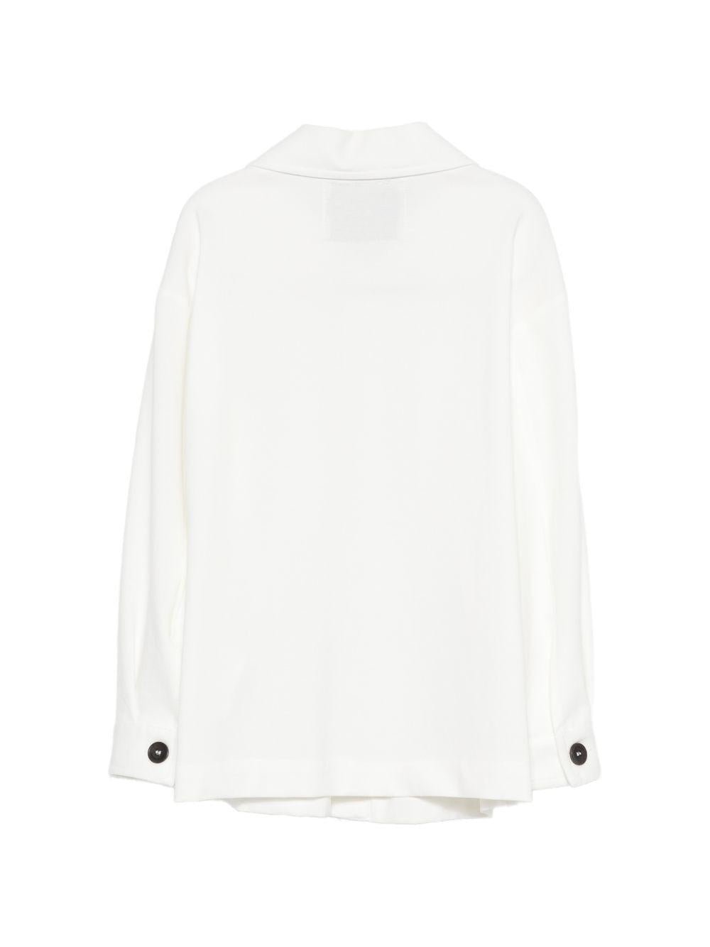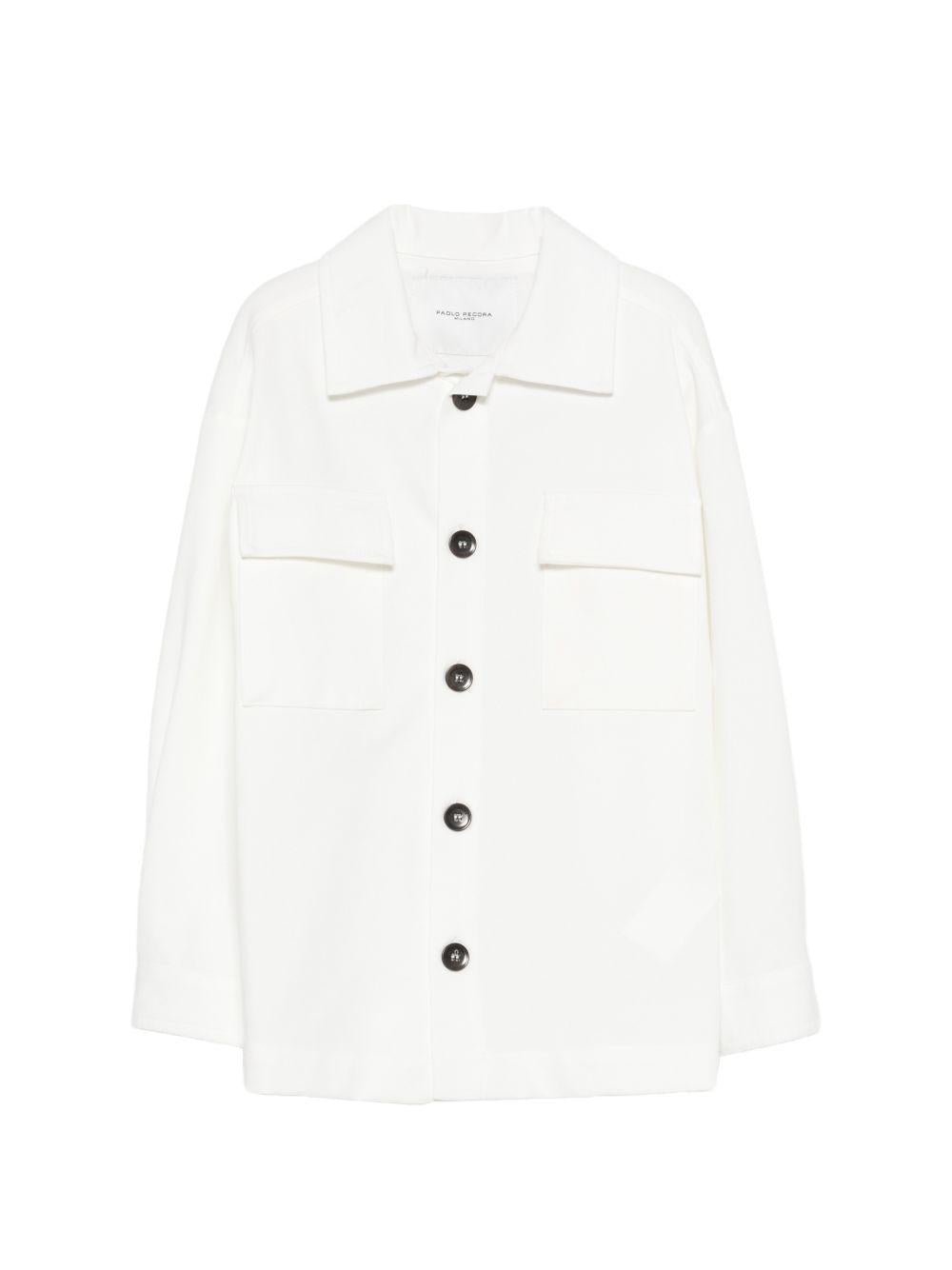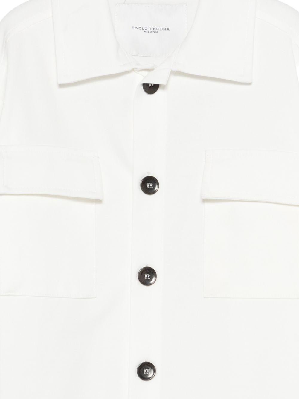 The Paolo Pecora Kids white jacket with pockets for boys is available on the RubinoKids.com online store. Made from 52% cotton, 40% polyamide, and 8% elastane, it features a white button-up front, long sleeves, flap pockets, buttoned hems, and a classic collar. Available in various sizes, it is part of the Paolo Pecora Kids Spring/Summer 2026 collection and is available for 24-48 hour delivery in Italy.