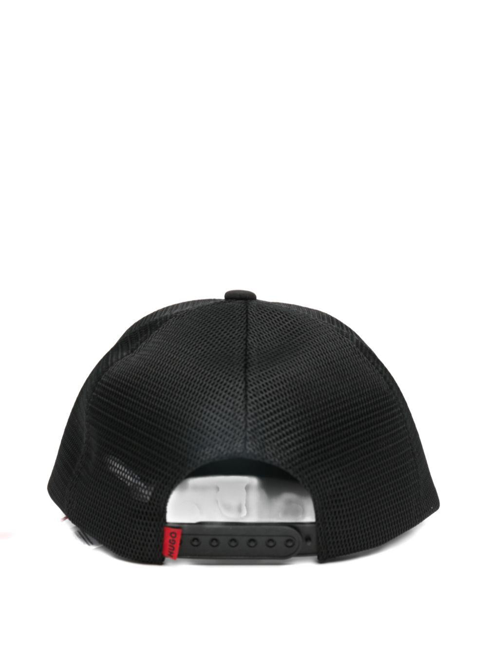 The Hugo Kids black hat with adjustable strap is available on the RubinoKids.com online store. Made of 100% polyester, it features a black/red color, black mesh, an adjustable strap, a flat visor, and a logo print. Available in various sizes, it is part of the Hugo Kids Spring/Summer 2026 collection and is available for 24-48 hour delivery in Italy.