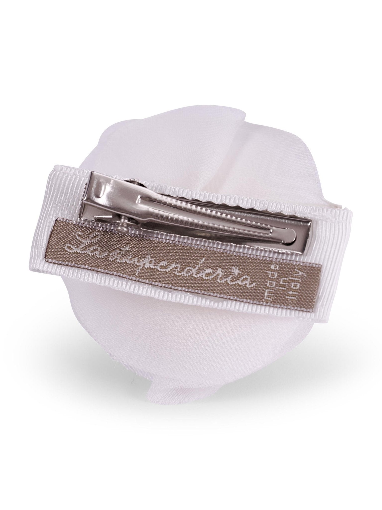The La Stupenderia pink hair clip with flower for girls is available on the RubinoKids.com online store. Made of 100% silk, it features a pink, duck-billed hair clip and a hand-crafted silk organza flower. Available in various sizes, it is part of the La Stupenderia Fall/Winter 2025 collection and is available for 24-48 hour delivery in Italy.