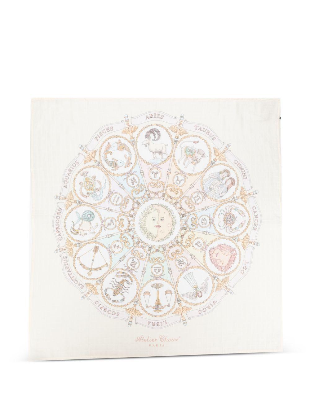 The Atelier Choux white baby crib blanket with zodiac print is available on the RubinoKids.com online store. Made of 100% cotton, it features an off-white color, a zodiac print, and organic cotton. It is part of the Atelier Choux Spring/Summer 2026 collection and is available for 24-48 hour delivery in Italy.