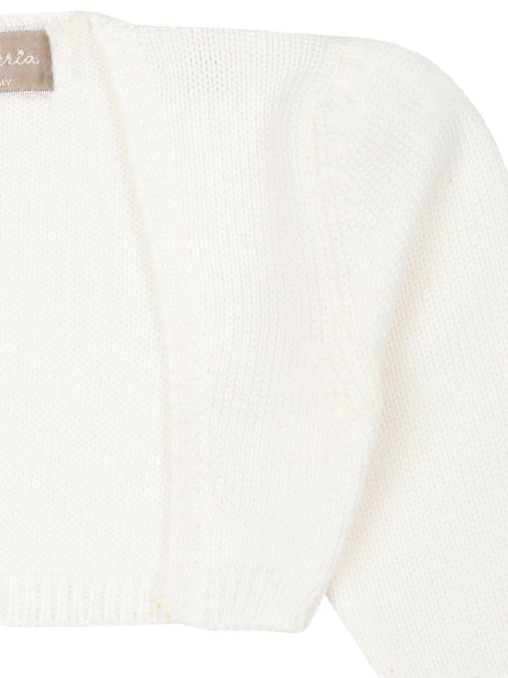 The La Stupenderia white cardigan for babies with an open front is available on the RubinoKids.com online store. Made from 100% Cashwool®, it features an open front with no closures, long sleeves, ruffled hems, and a ribbed hem. This size is from the La Stupenderia Fall/Winter 2025 collection and is available for immediate shipment with delivery within 24-48 hours in Italy.
