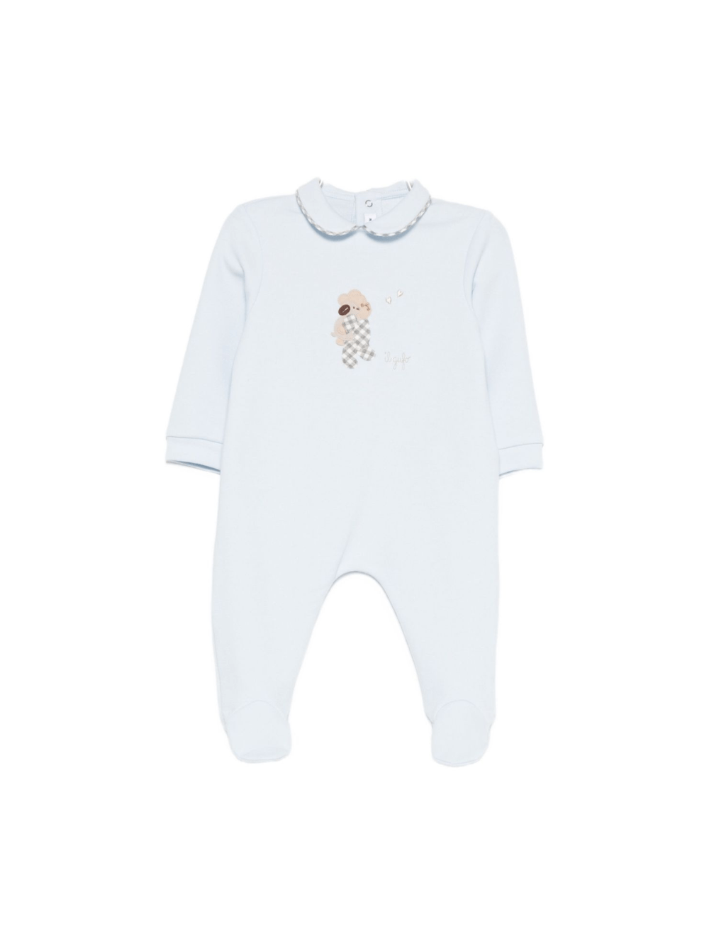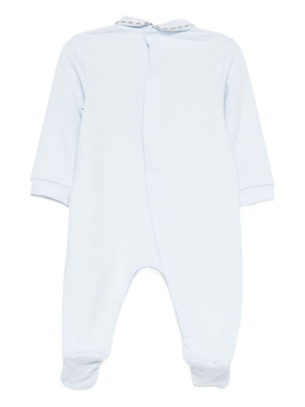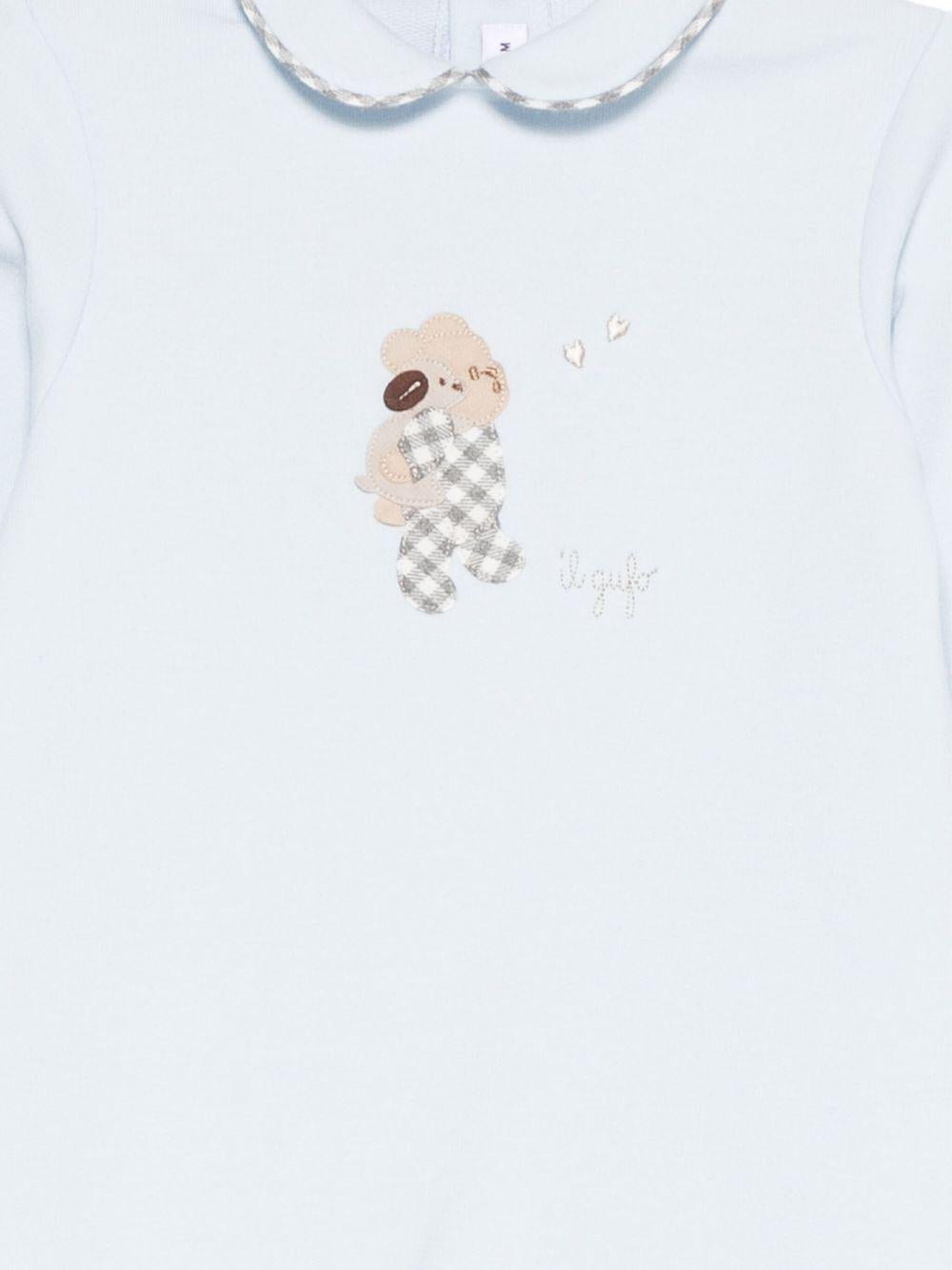 The Il Gufo baby onesie in light blue with a Peter Pan collar is available on the RubinoKids.com online store. Made of 100% cotton, it features a light blue Peter Pan collar, animal embroidery on the front, feet, and long sleeves. Available in various sizes, it is part of the Il Gufo Fall/Winter 2025 collection and is available for 24-48 hour delivery in Italy.