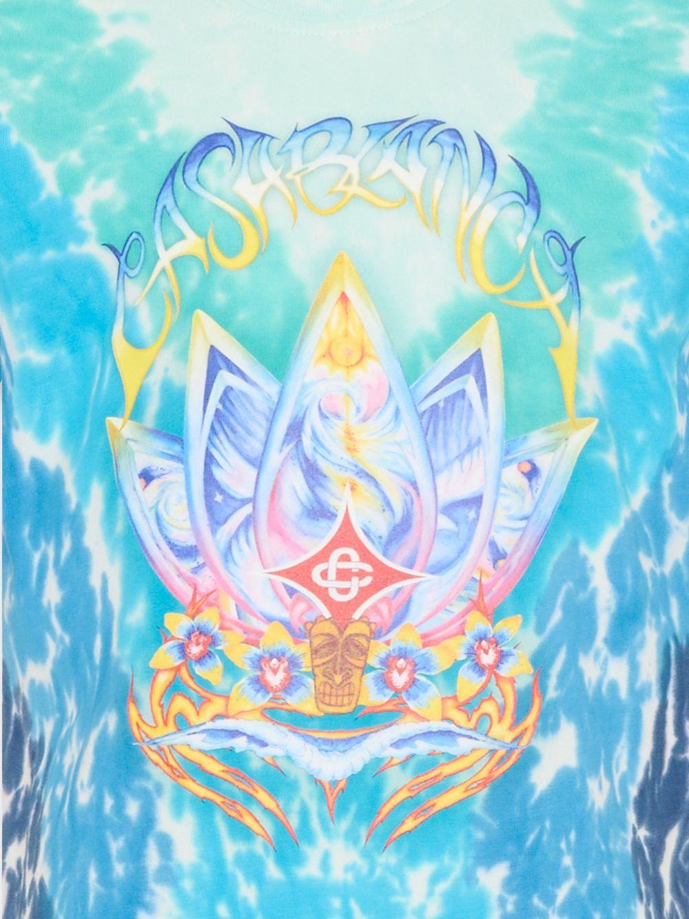 The Casablanca Kids blue tie-dye T-shirt for boys is available on the RubinoKids.com online store. Made of 100% cotton, it features a blue tie-dye design, short sleeves, and a crew neck. Available in various sizes, it is part of the Casablanca Kids Spring/Summer 2026 collection and is available for immediate shipment with delivery within 24-48 hours in Italy.