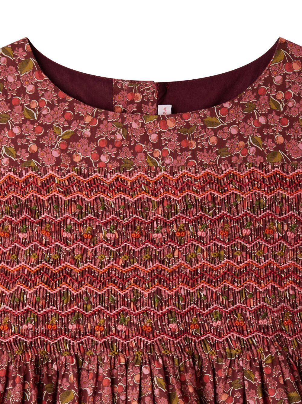 The Bonpoint red dress for girls with a floral and cherry print is available on the RubinoKids.com online store. Made of 100% cotton, it features a red floral and cherry print, long sleeves, a button closure, and pleated detail. Available in various sizes, it is part of the Bonpoint Fall/Winter 2025 collection and is available for immediate shipment with delivery within 24-48 hours in Italy.