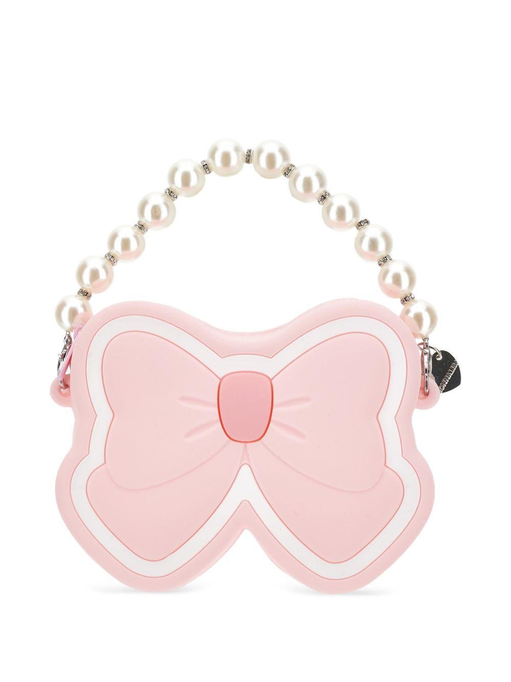 The Monnalisa pink handbag for girls with butterfly design is available on the RubinoKids.com online store. Made of 100% plastic, it features a pink color, a bow detail, pearl decoration, a heart-shaped charm, a zip closure, a pearl handle, and a butterfly design. It is part of the Monnalisa Spring/Summer 2026 collection and is available for 24-48 hour delivery in Italy.