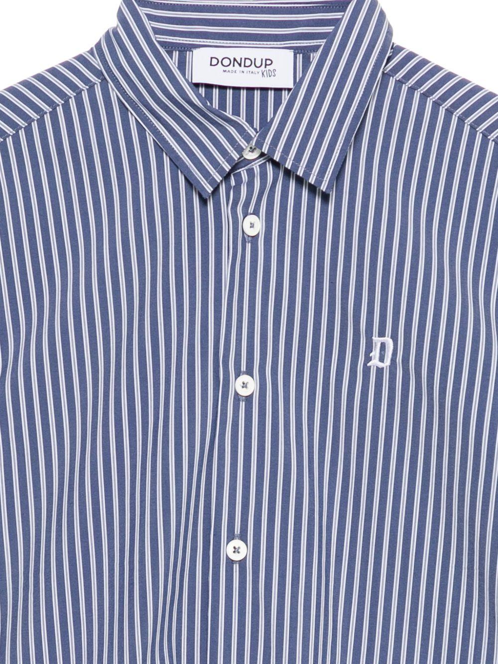 The DONDUP Kids blue striped shirt for boys is available on the RubinoKids.com online store. Made of 100% cotton, it features a blue striped design, a classic collar, long sleeves, buttoned cuffs, and an embroidered logo. Available in various sizes, it is part of the DONDUP Kids Spring/Summer 2026 collection and is available for 24-48 hour delivery in Italy.