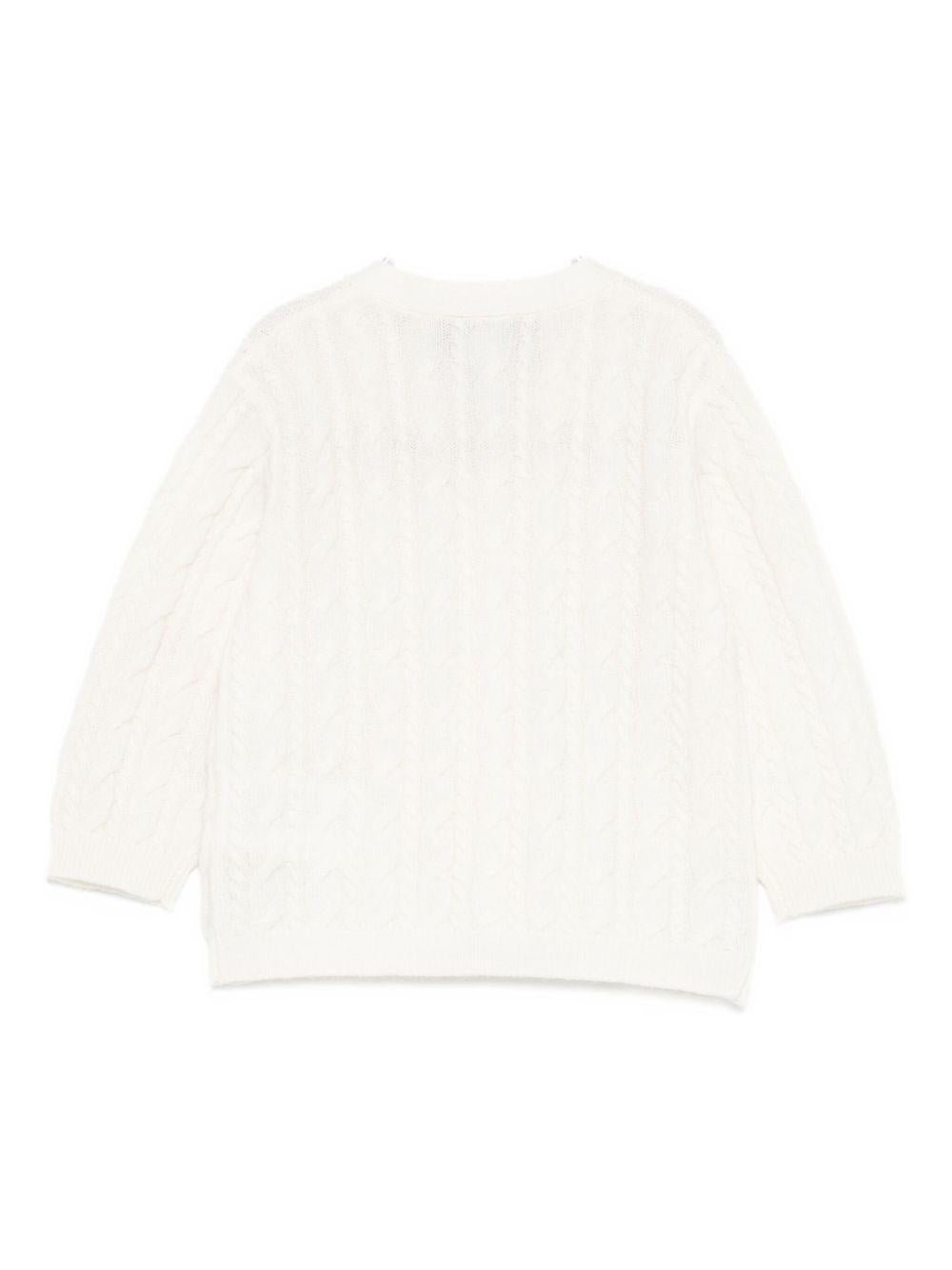 The Tartine Et Chocolate white cardigan for baby girls with front button closure is available on the RubinoKids.com online store. Made of 100% cashmere, it features a white cashmere cable knit, front button closure, and long sleeves. Available in various sizes, it is part of the Tartine Et Chocolate Fall/Winter 2025 collection and is available for 24-48 hour delivery in Italy.