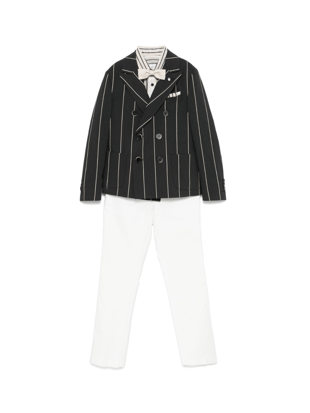 The Colorichiari black striped 3-piece set for boys with double-breasted closure is available on the RubinoKids.com online store. Made of 65% cotton, 30% polyester, and 5% synthetic fiber, it features a black color, a double-breasted button closure, a front button placket, a concealed zip and button closure, and buttoned cuffs. Available in various sizes, it is part of the Colorichiari Spring/Summer 2025 collection and is available for immediate shipment with delivery within 24-48 hours in Italy.