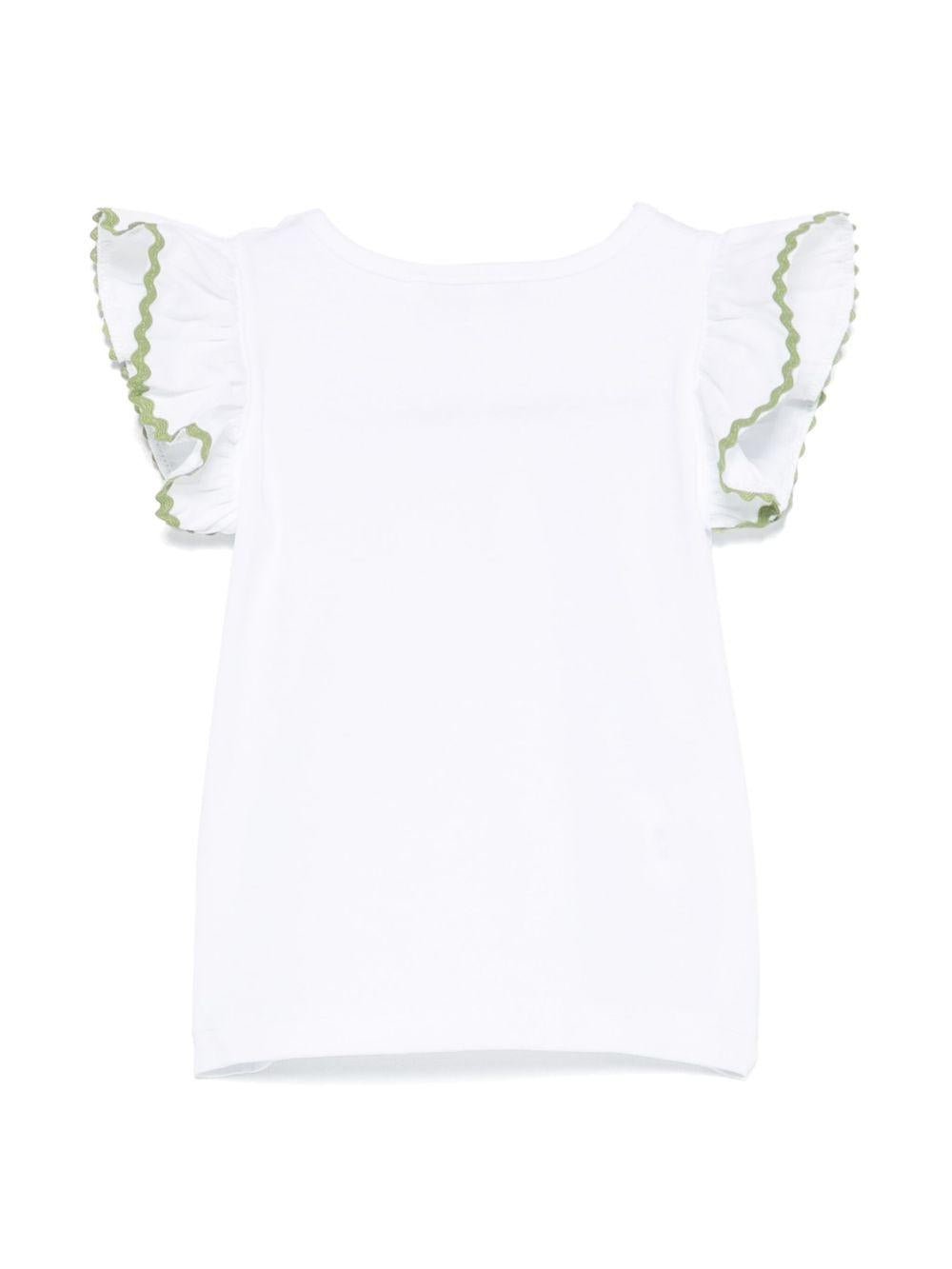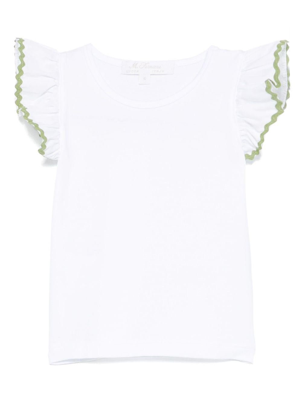 The Mariella Ferrari white baby girl's top with scalloped detail is available on the RubinoKids.com online store. Made of 100% cotton, it features a white crew neck, short sleeves, and a straight hem. Available in various sizes, it is part of the Mariella Ferrari Spring/Summer 2025 collection and is available for immediate shipment with delivery within 24-48 hours in Italy.