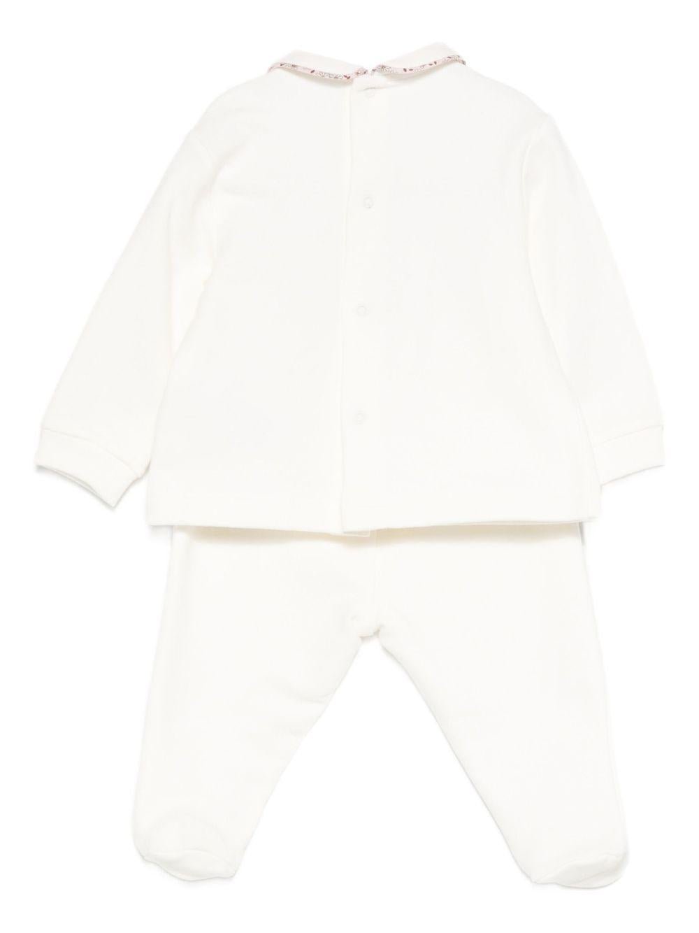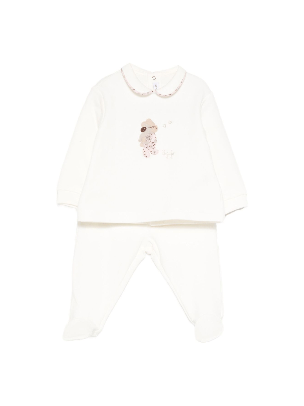 The Il Gufo white pajamas for newborns and baby girls with animal embroidery on the front are available on the RubinoKids.com online store. Made of 94% cotton, 6% elastane, they are white, have a Peter Pan collar, button closure, long sleeves, and animal embroidery details on the front. Available in various sizes, they are part of the Il Gufo Fall/Winter 2025 collection and are available for 24-48 hour delivery in Italy.