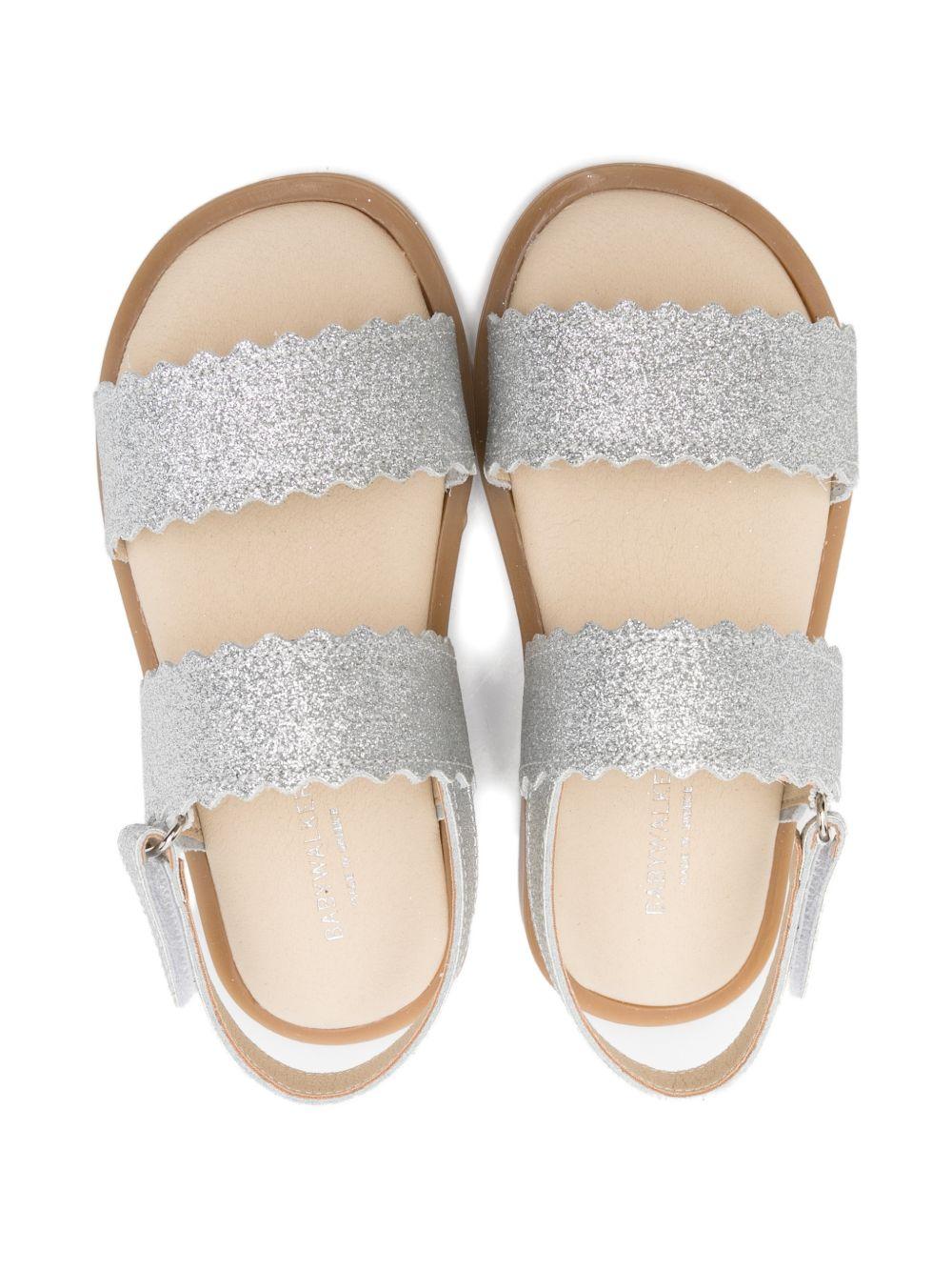 The BabyWalker girls' silver sandals with scalloped edges are available on the RubinoKids.com online store. Made of 100% leather, they feature a silver color, scalloped edges, two straps, and leather. Available in various sizes, they are part of the BabyWalker Spring/Summer 2026 collection and are available for 24-48 hour delivery in Italy.
