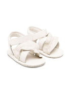 Il prodotto Sandali per neonata Donsje Miene bianco con chiusura frontale a strappo è disponibile sullo store online RubinoKids.com. Realizzato in pelle 100%. Il prodotto presenta un colore bianco, chiusura frontale a strappo, soletta in pelle con logo, suola piatta. Varie taglie a catalogo, appartiene alla collezione Donsje Primavera/Estate 2025 ed è disponibile in pronta spedizione con consegna in 24/48h per l'Italia.
