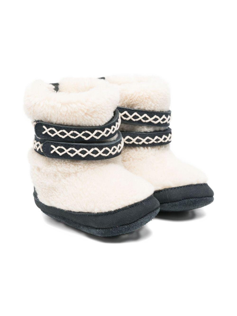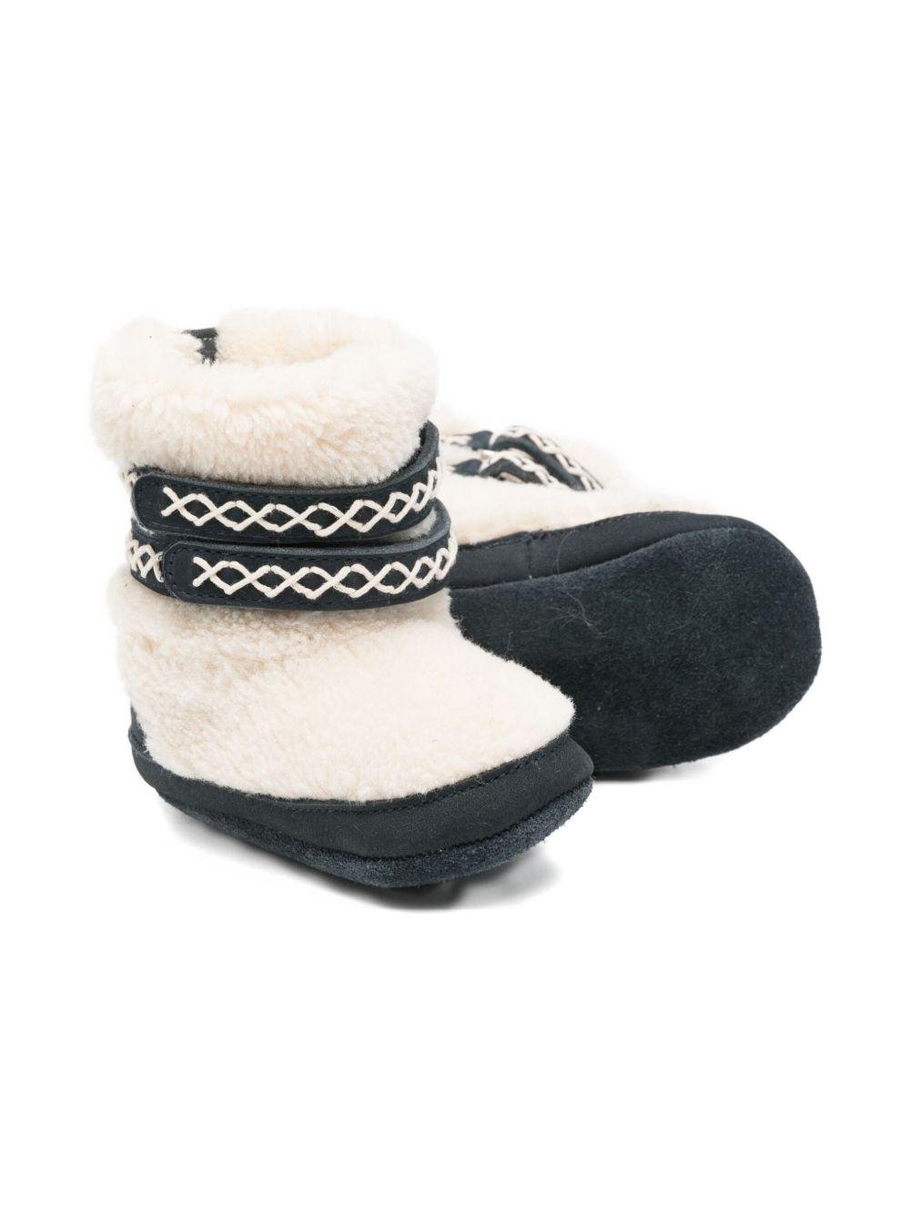 Il prodotto Stivali per neonata Donsje bianchi con cinturino in pelliccia di montone è disponibile sullo store online RubinoKids.com. Realizzato in poliestere 100%, pelle 100%. Il prodotto presenta un colore bianco, cinturini con motivo in shearling, suola in pelle scamosciata, stile slip-on, polsino ripiegato. Varie taglie a catalogo, appartiene alla collezione Dosje Autunno/ Inverno 2025 ed è disponibile con consegna in 24/48h per l'Italia.
