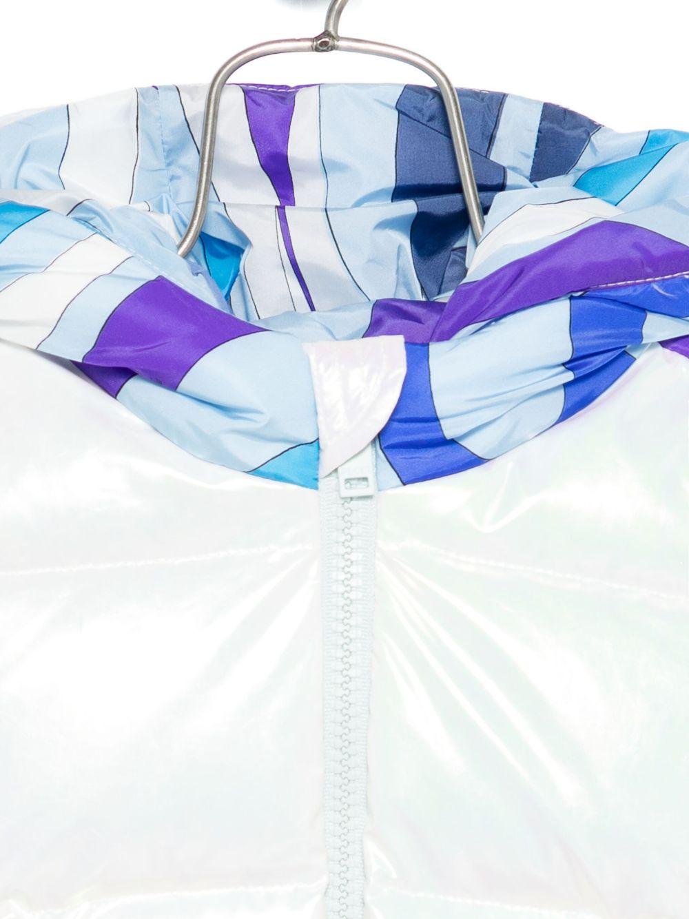 Giubbino per neonata Emilio Pucci Junior bianco con cappuccio con stampa geometrica azzurra