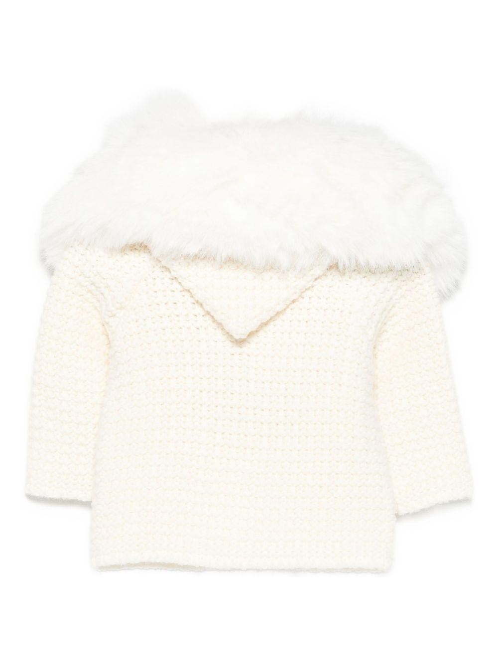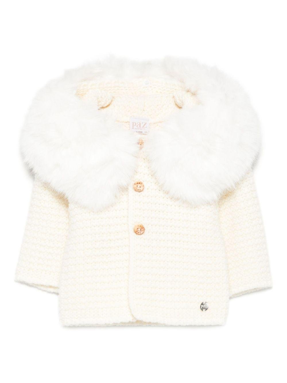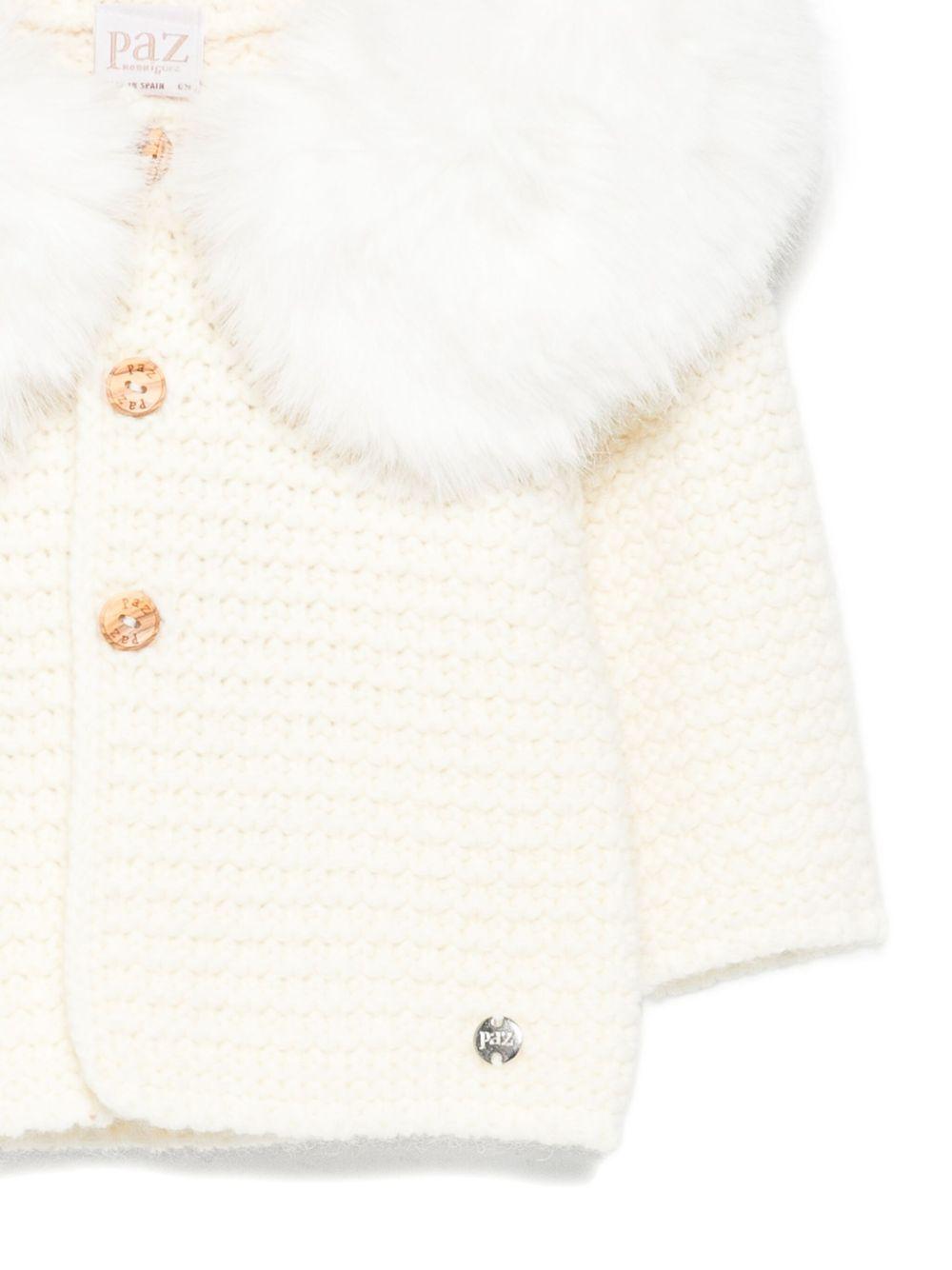 Il prodotto Giubbino per neonati Paz Rodrìguez bianco con cappuccio è disponibile sullo store online RubinoKids.com. Realizzato in lana 50%, acrilico 50%. Il prodotto presenta un colore bianco, finitura in pelliccia sintetica, scollo con cappuccio, lavorazione a maglia, maniche lunghe, chiusura a bottoni. Varie taglie a catalogo, appartiene alla collezione Paz Rodríguez Autunno/Inverno 2025 ed è disponibile con consegna in 24/48h per l'Italia.