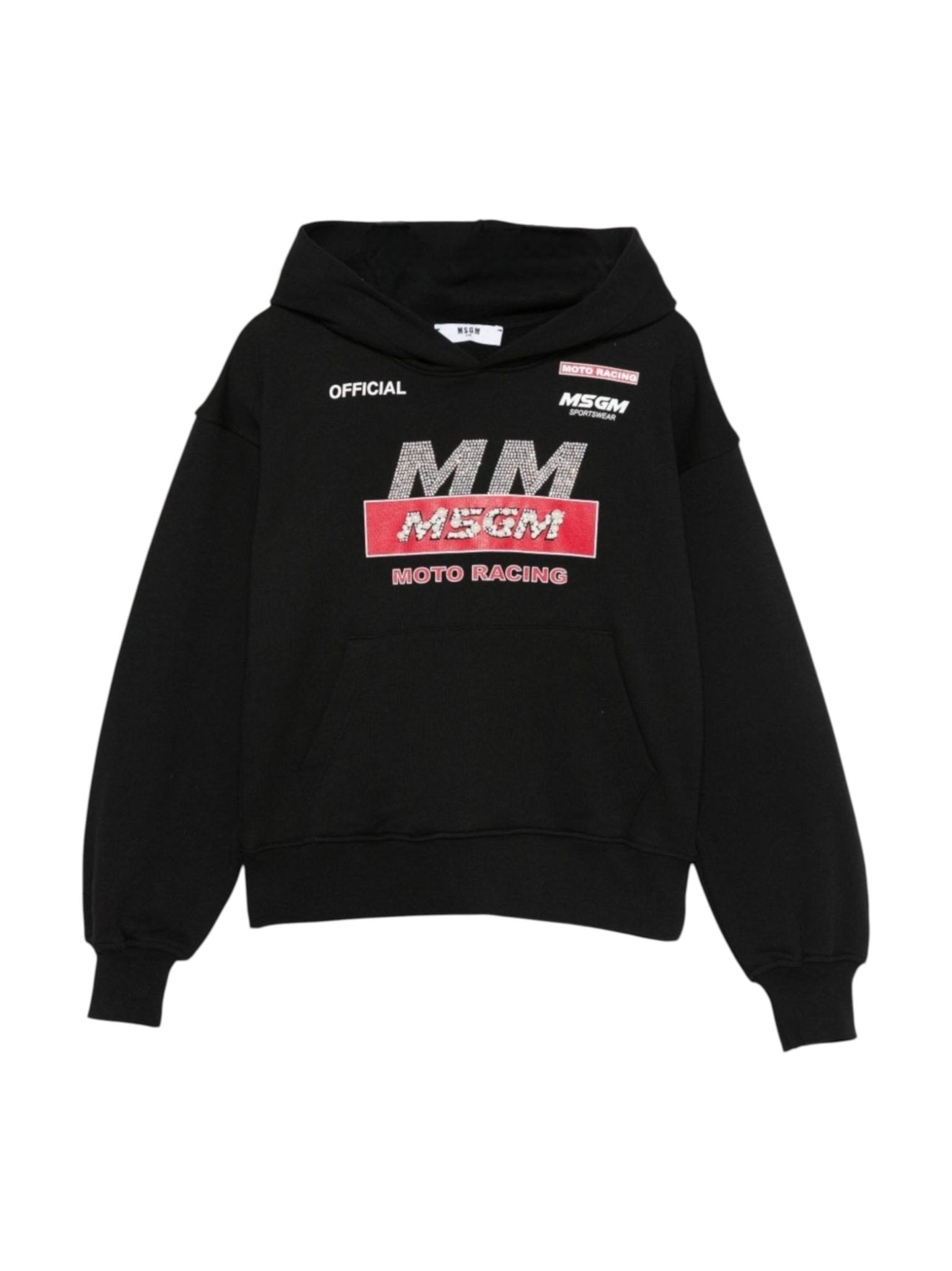 Il prodotto Felpa per bambina MSGM Kids nera impreziosita da cristalli è disponibile sullo store online RubinoKids.com. Realizzato in cotone 100%. Il prodotto presenta un colore nero, tasca a marsupio, stampa di corse motociclistiche, decorazioni in cristallo. Varie taglie a catalogo, appartiene alla collezione MSGM Kids Autunno/Inverno 2025 ed è disponibile con consegna in 24/48h per l'Italia.