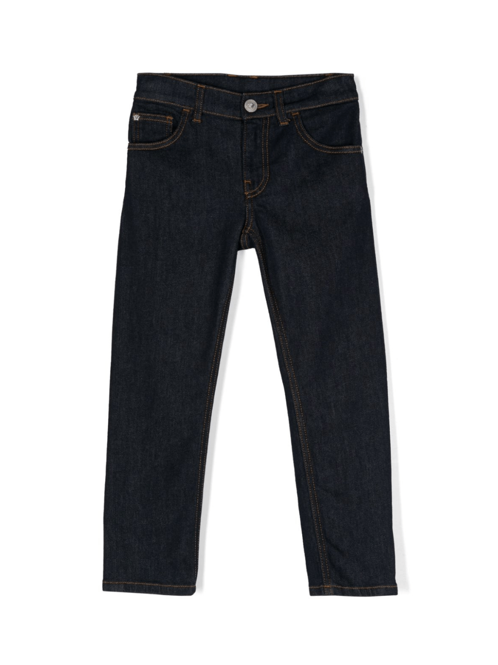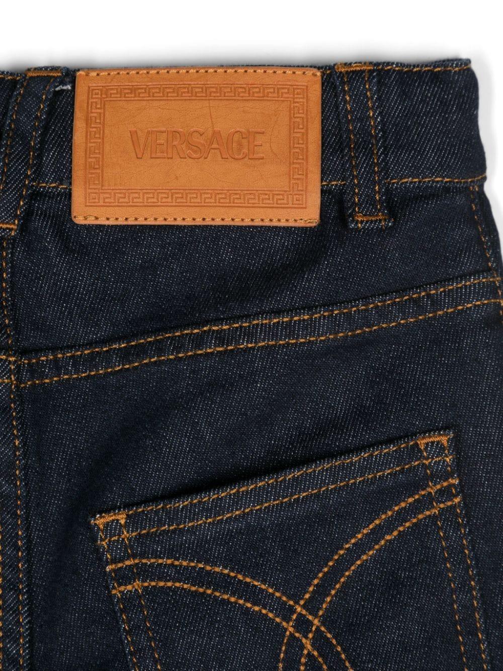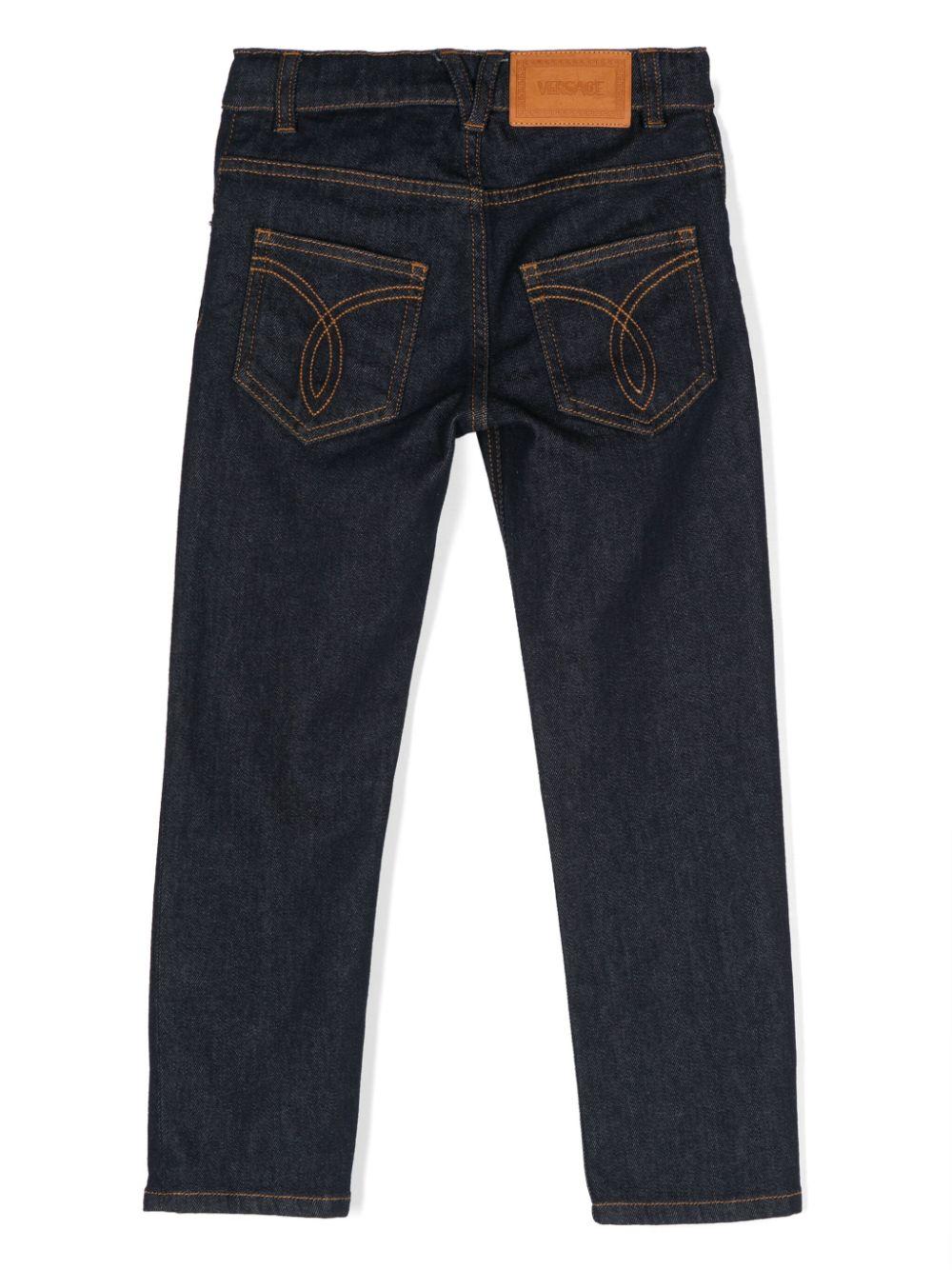 Il prodotto Versace Kids Jeans a gamba dritta a vita media è disponibile sullo store online RubinoKids.com. Realizzato in cotone 95%, elastomultiestere 3%, elastan 2%. Il pantalone presenta un denim di misto cotone blu notte lavaggio medio cuciture a contrasto firma Medusa Head toppa con logo sul bottone sul retro passanti per cintura chiusura frontale con zip e bottone cinque tasche classiche gamba dritta. Taglia a catalogo, appartiene alla collezione Versace Kids Autunno/Inverno 2024 ed è disponibile in pronta spedizione con consegna in 24/48h per l'Italia.