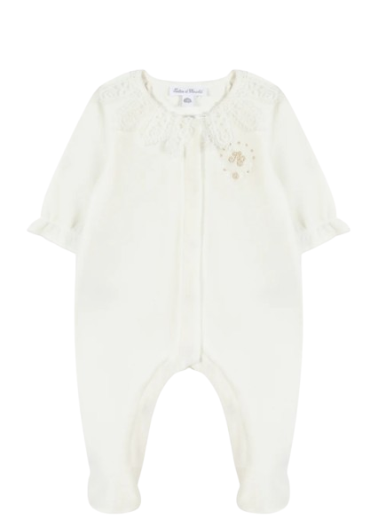 Il prodotto Tutina per neonata Tartine Et Chocolate bianca con colletto in pizzo è disponibile sullo store online RubinoKids.com. Realizzato in cotone 85%, poliestere 15%. Il prodotto presenta un colore bianco, colletto in pizzo, texture in velluto, maniche lunghe, polsini arricciati. Varie taglie a catalogo, appartiene alla collezione Tartine Et Chocolate Autunno/ Inverno 2025 ed è disponibile con consegna in 24/48h per l'Italia.