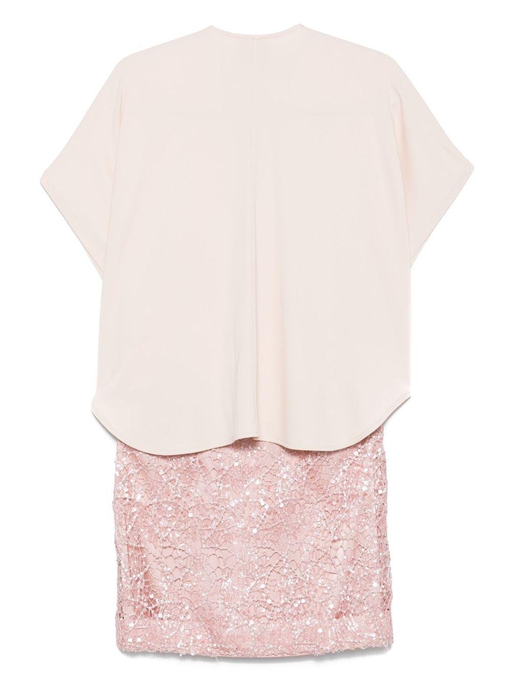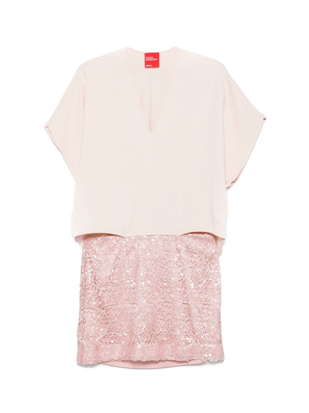 Il prodotto Abito corto per donna Merci rosa con inserti in pizzo è disponibile sullo store online RubinoKids.com. Realizzato in poliestere 100%, viscosa 94%, elastam 6%. Il prodotto presenta un colore rosa chiaro, chiusura laterale con zip e gancio nascosta, scollo a V, maniche corte, orlo asimmetrico. Varie taglie a catalogo, appartiene alla collezione Merci Primavera/Estate 2025 ed è disponibile in pronta spedizione con consegna in 24/48h per l'Italia.