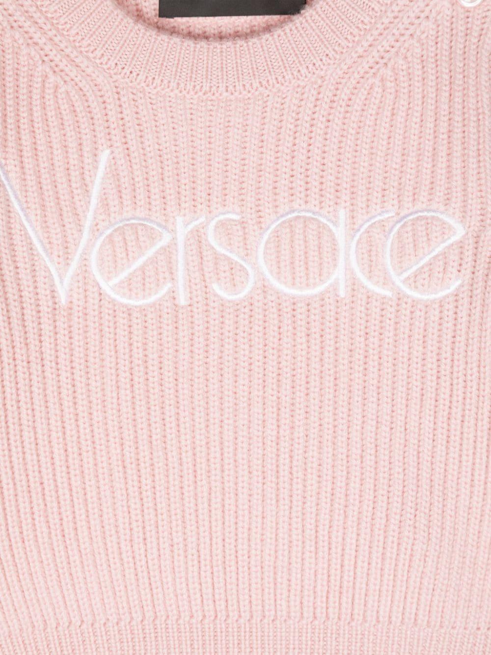 Il prodotto Versace Kids Maglione lavorato a maglia con logo ricamato è disponibile sullo store online RubinoKids.com. Realizzato in lana vergine 100%. Il maglione presenta un lavorazione a maglia, in lana vergine rosa chiaro, maglia da pescatore, girocollo a coste, logo ricamato sul davanti, maniche lunghe, polsini e orlo a coste, orlo dritto, chiusura con bottoni sulla spalla. Varie taglie a catalogo, appartiene alla collezione Versace Kids Autunno/Inverno 2024 ed è disponibile in pronta spedizione con consegna in 24/48h per l'Italia.