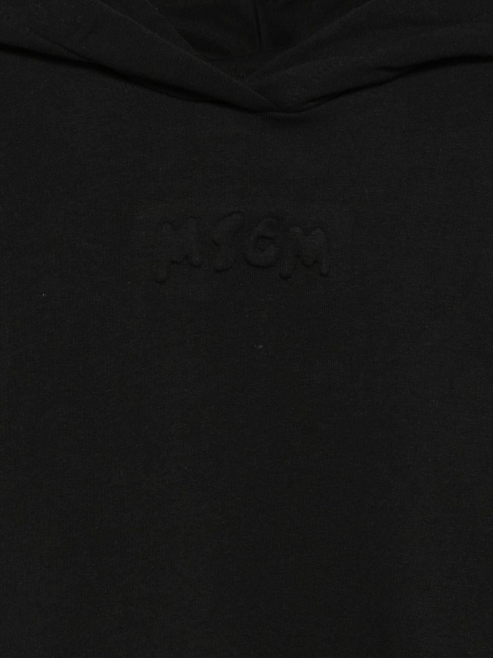 The MSG Kids black dress for girls with embossed logo is available on the RubinoKids.com online store. Made of 100% cotton, it features a black hood, a scoop neck, long sleeves, two pockets, and a flap with an embossed logo. Available in various sizes, it is part of the MSGM Kids Fall/Winter 2025 collection and is available for 24-48 hour delivery in Italy.