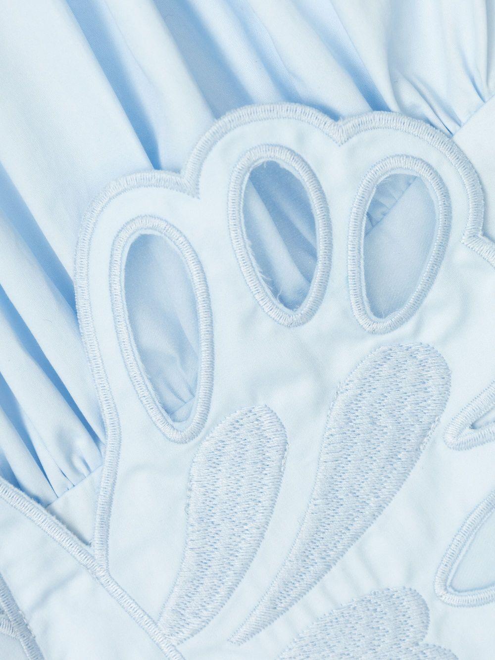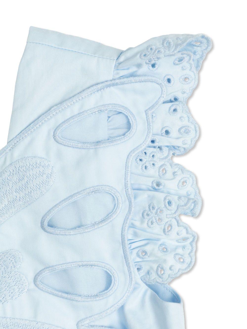 The Self-Portrait Kids light blue dress for girls with a butterfly design is available on the RubinoKids.com online store. Made of 100% cotton, it features a light blue color, a hidden back zip closure, sleeveless design, ruffled details, and an embroidered design. Available in various sizes, it is part of the Self-Portrait Kids Spring/Summer 2025 collection and is available for immediate shipment with delivery within 24-48 hours in Italy.